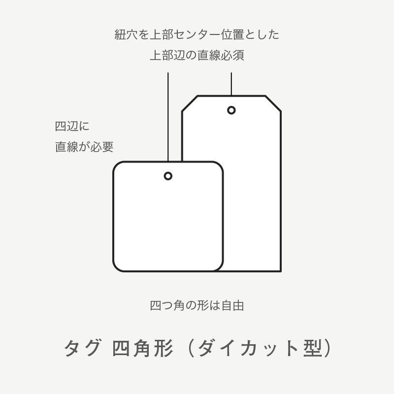 [タグの種類] 四角形(ダイカット型)※四つ角は自由、四辺に直線が必要 、上部辺の直線必須、紐穴が幅のセンター位置
