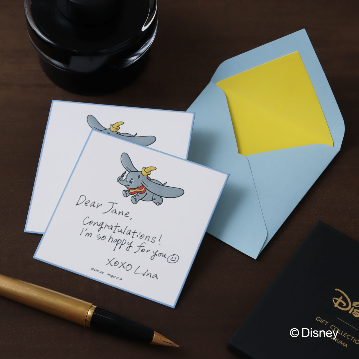 大人のための上質なステーショナリーカードセット。時を超えて愛されるディズニーキャラクターが、さりげない遊び心を添えています。正方形のミニカードはひと言メッセージにぴったりのサイズ。手書きのメッセージを温かく届けるこのカードは、お礼やお祝いの言葉を添える場面を上品に彩ります。
