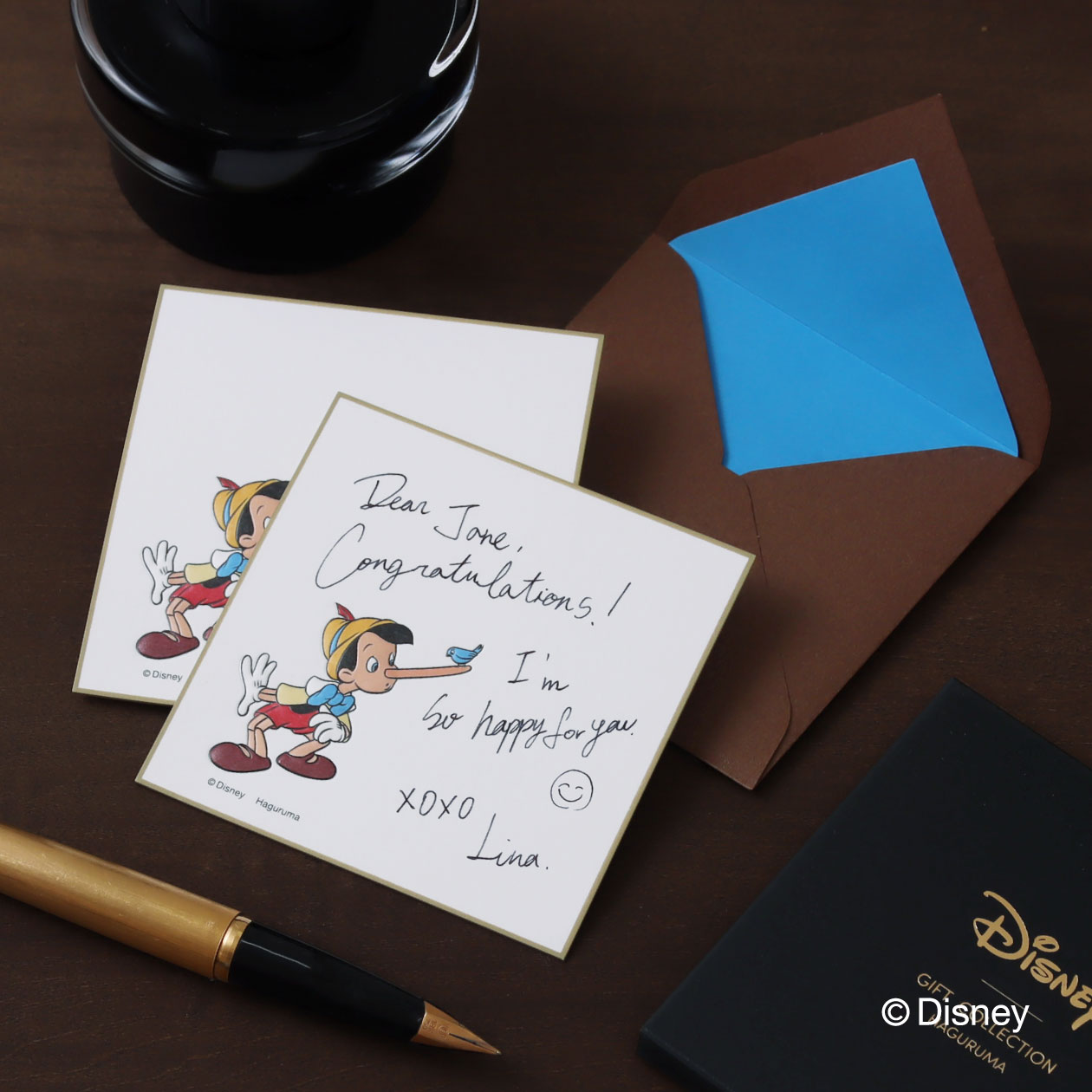 大人のための上質なステーショナリーカードセット。時を超えて愛されるディズニーキャラクターが、さりげない遊び心を添えています。正方形のミニカードはひと言メッセージにぴったりのサイズ。手書きのメッセージを温かく届けるこのカードは、お礼やお祝いの言葉を添える場面を上品に彩ります。