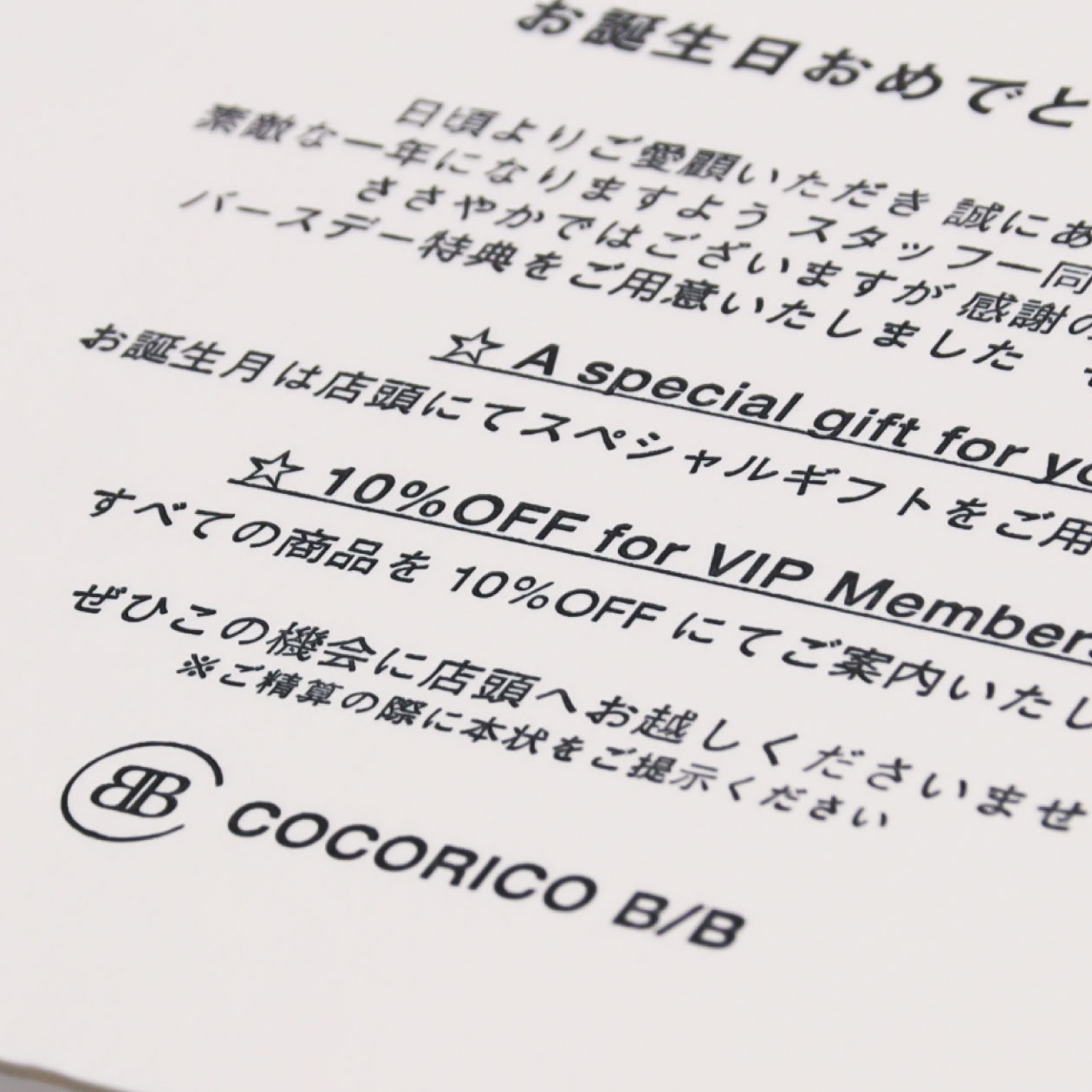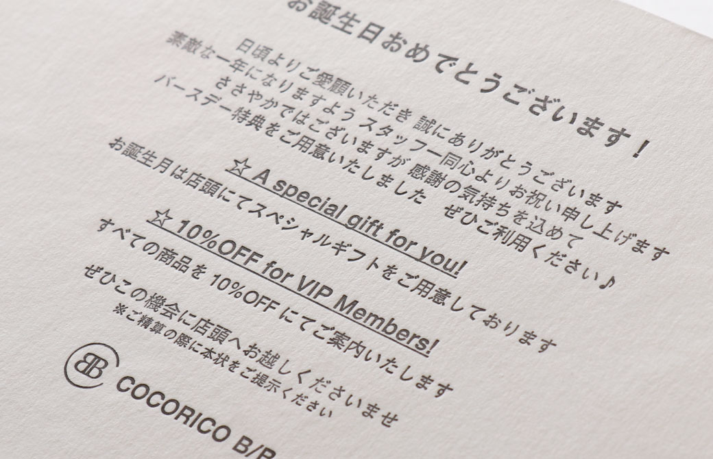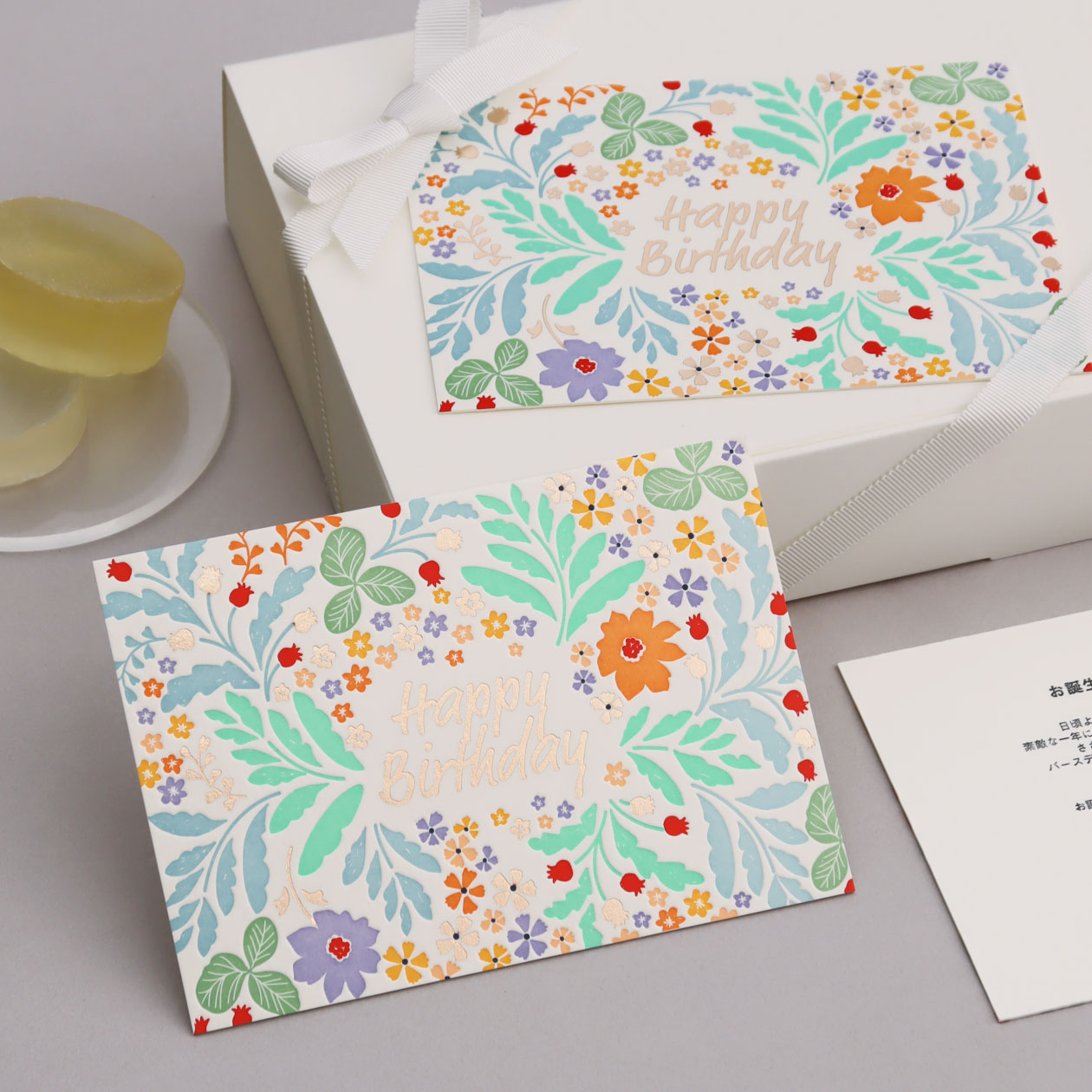 豪華な8色の多色活版印刷で仕上げたバースデーカード。上顧客やVIP会員への贈り物として、より贅沢な印象を演出します。活版印刷ならではの凹凸のある手触りが特別感を引き立てます。さらに、タイトルや全体に箔押しをあしらい、きらびやかで華やかな仕上がりに。
