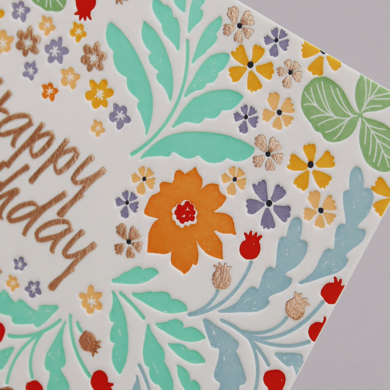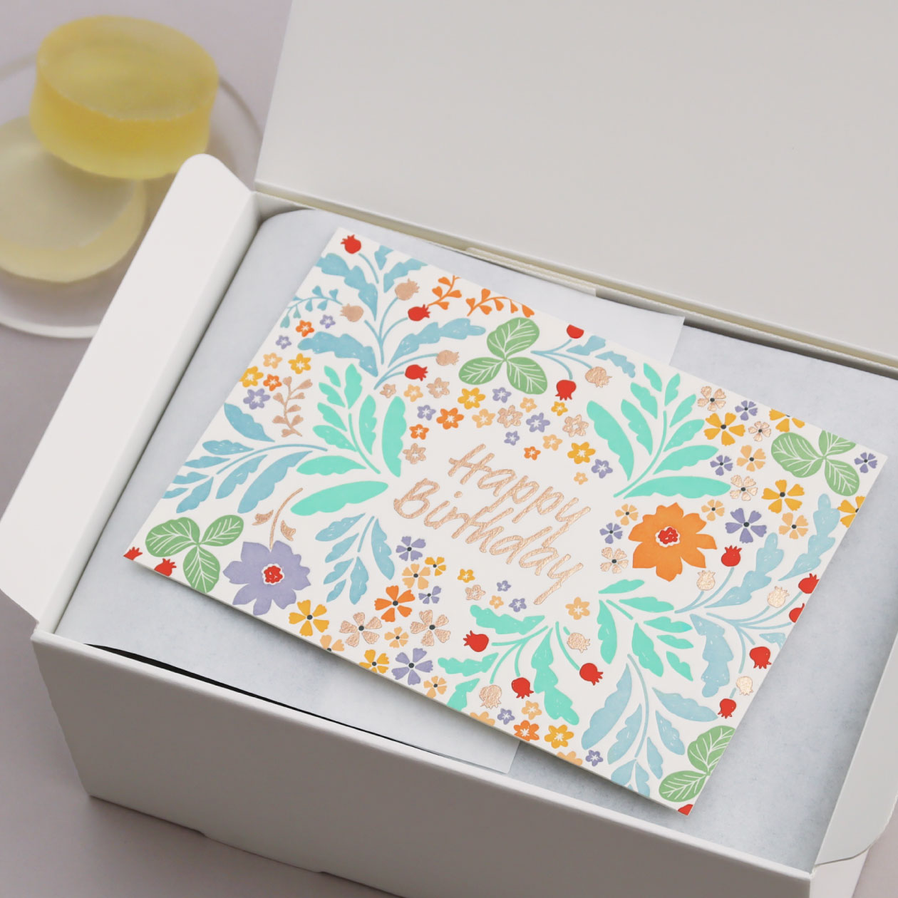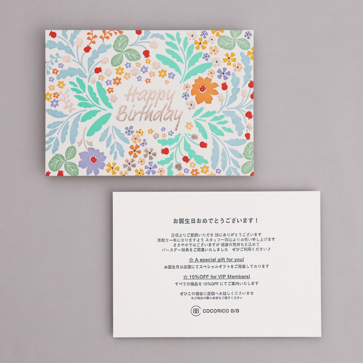 豪華な8色の多色活版印刷で仕上げたバースデーカード。上顧客やVIP会員への贈り物として、より贅沢な印象を演出します。活版印刷ならではの凹凸のある手触りが特別感を引き立てます。さらに、タイトルや全体に箔押しをあしらい、きらびやかで華やかな仕上がりに。