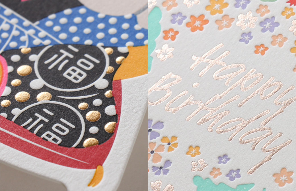 箔押し加工の周りに活版印刷をして圧を加えて凹ませると、箔押し部分が盛り上がる効果が得られます。逆に、箔押し加工の周りに活版印刷がなければ、フラットで少し凹んだ仕上がりになります。 -