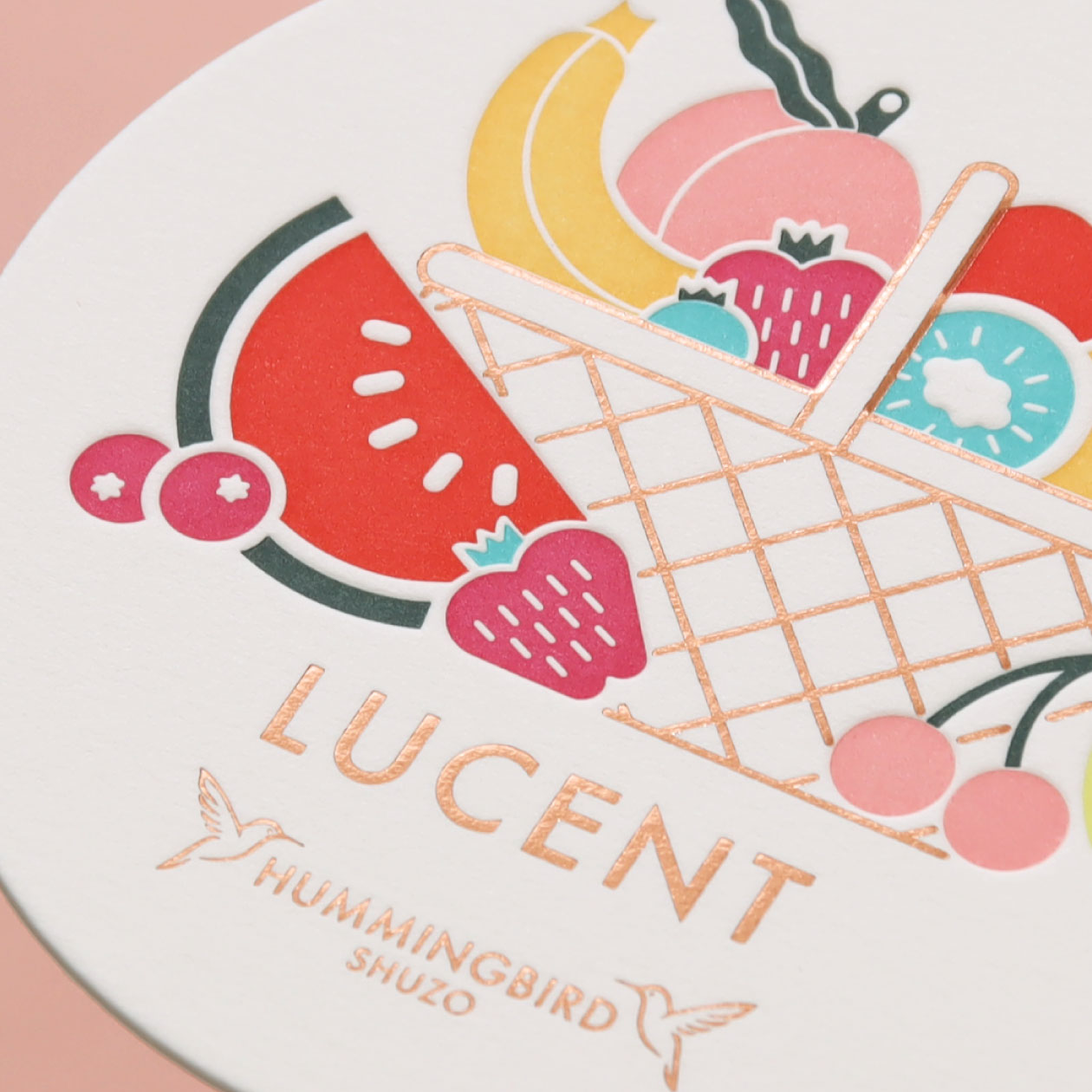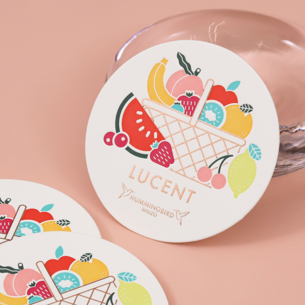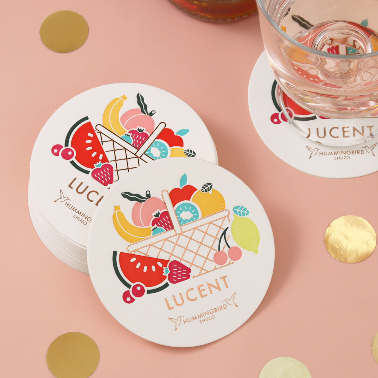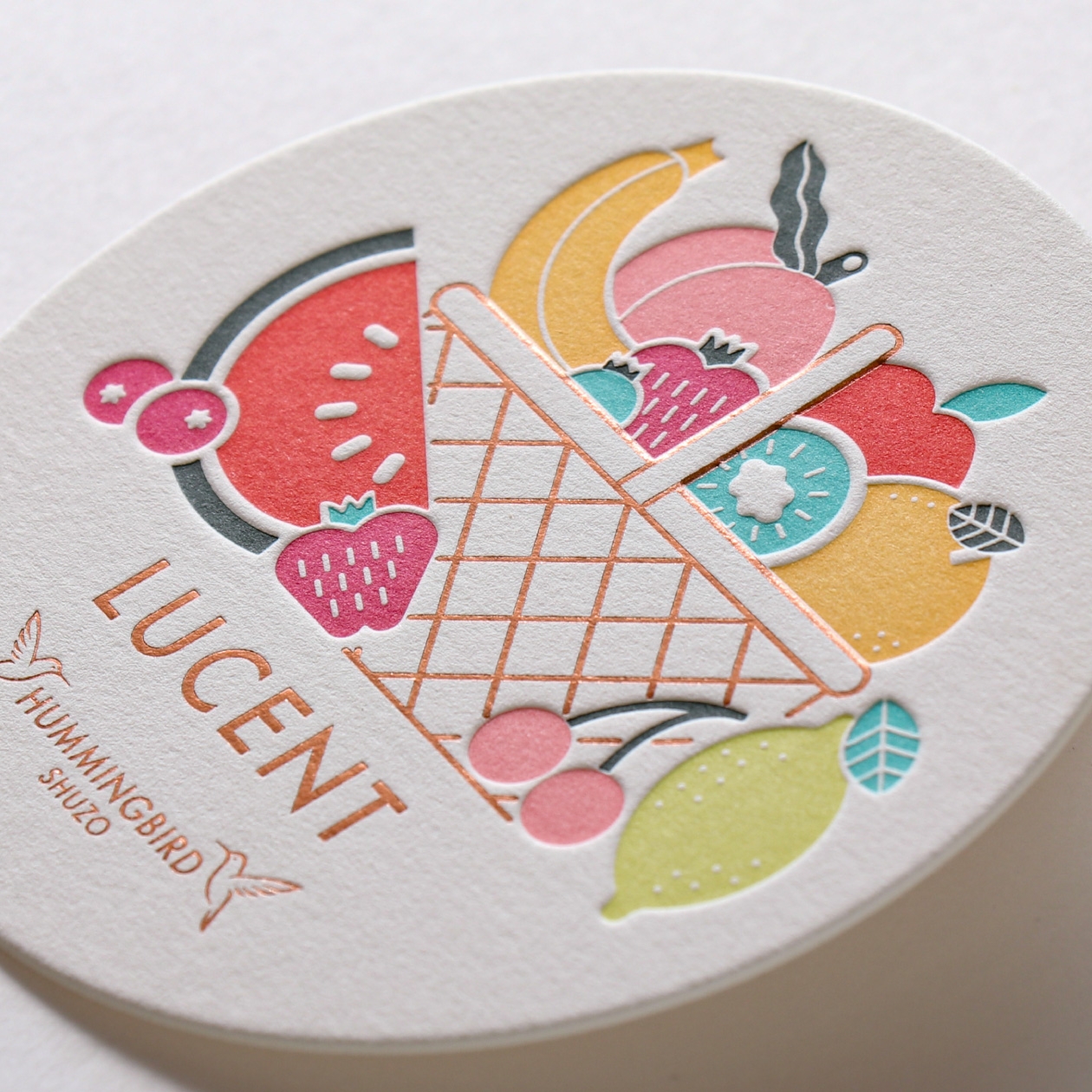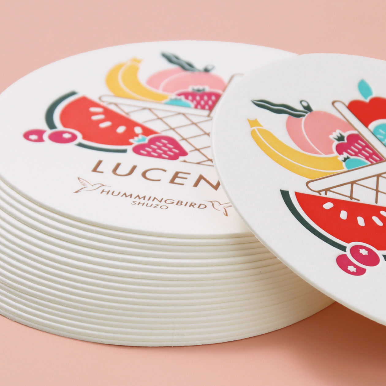 カラフルな多色活版印刷で仕上げた、新商品ワインのローンチ用のノベルティコースター。テーブルを華やかに彩るだけでなく、飾ってアートとしても楽しめます。活版印刷ならではの凹凸と色の重なりが、手に取るたびに特別な印象を与えます。華やかで印象的なオリジナルノベルティをお作りいただけます。