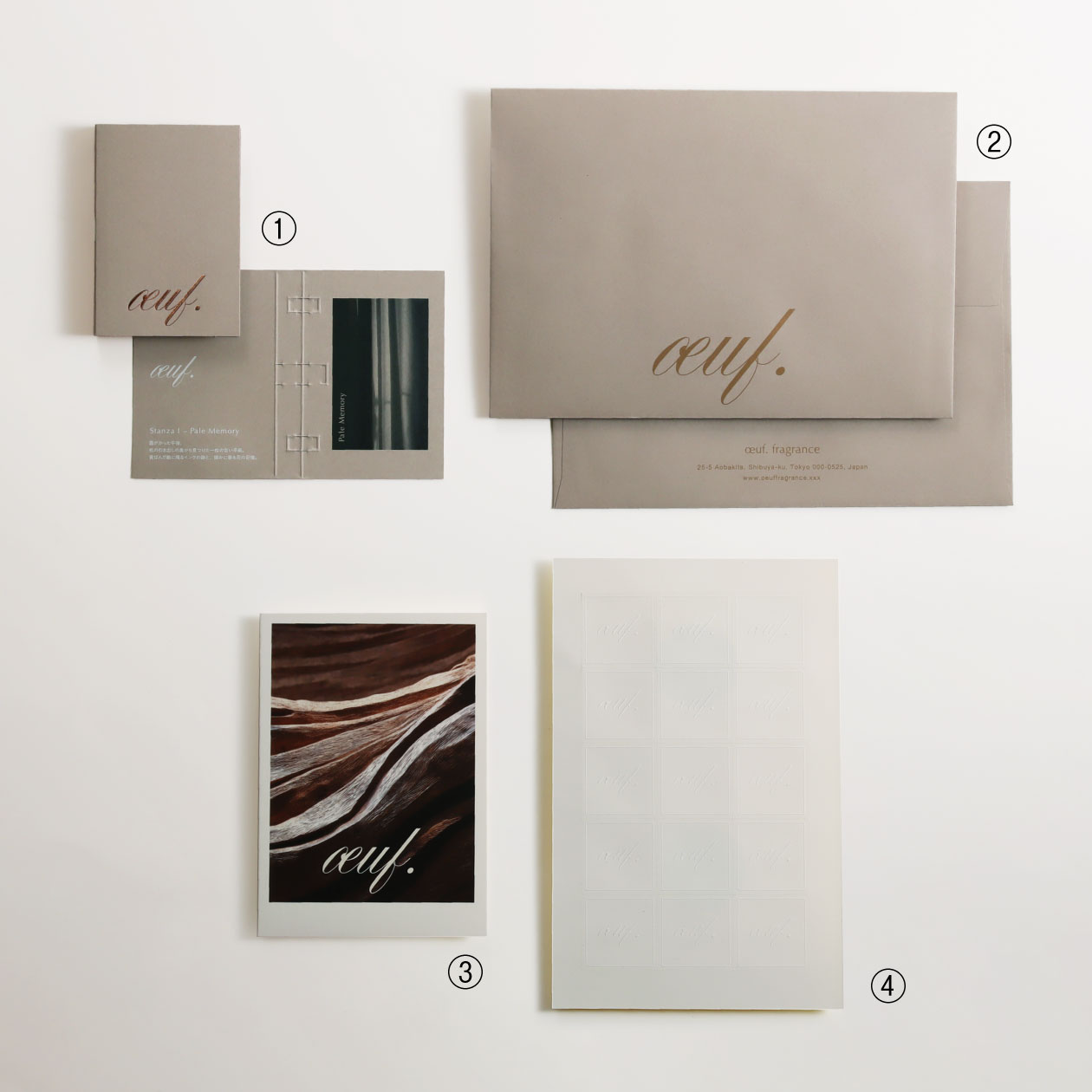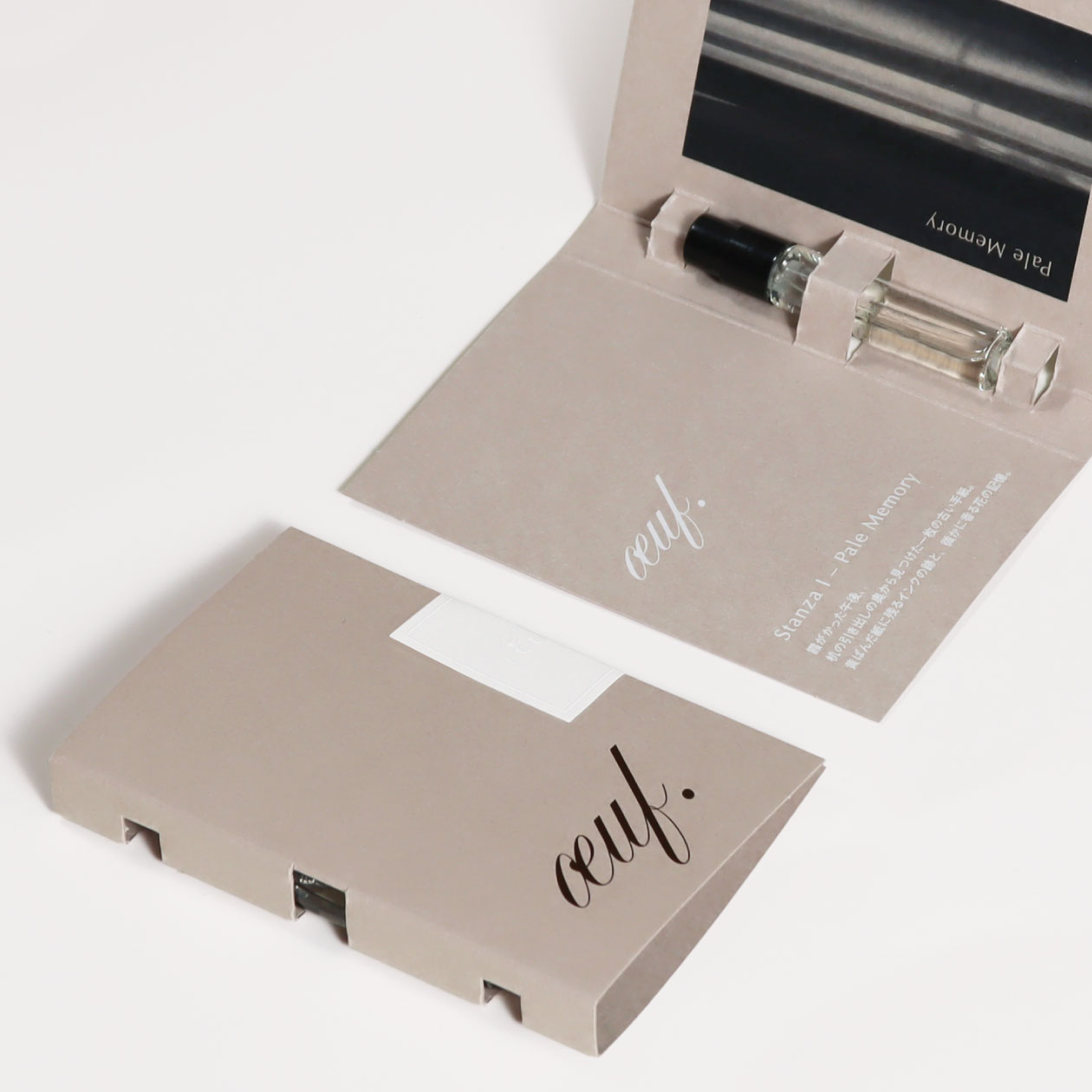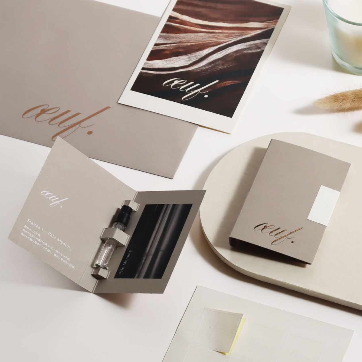 フレグランスブランドの発送用封筒と試供品ボトルを入れるブック型のケース。Colorsグレージュの紙素材とゴールドの組み合わせで上品な仕上がりに。角6カマス封筒はサンプルや小型商品の郵送におすすめのサイズです。ブック型ケースはオリジナルサイズで制作も可能です。(アトマイザーのサイズの目安:直径約11×高さ60mm)