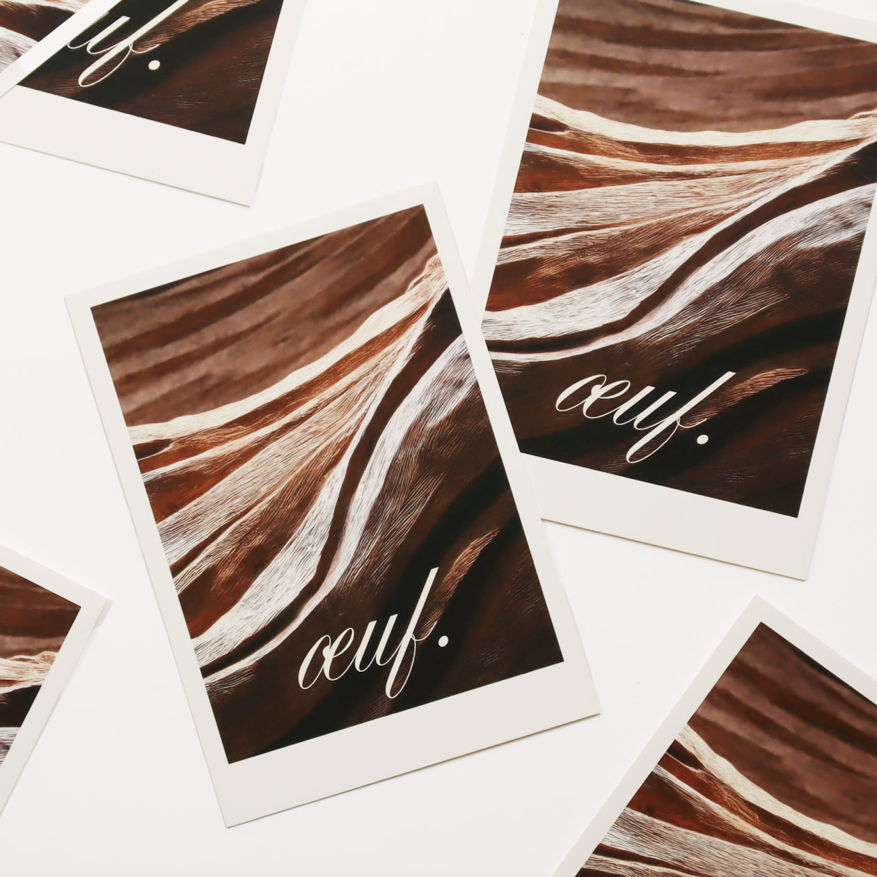 風合いのあるBasicの紙に、ホワイトの印刷を施したチョコレートを入れるパッケージ封筒。インクのツヤが紙の質感と調和し、角度によって表情が変化します。ツヤ感のある印刷と風合いのある紙素材のコントラストが印象的で、上品さの中にヴィンテージの香りが漂うパッケージです。