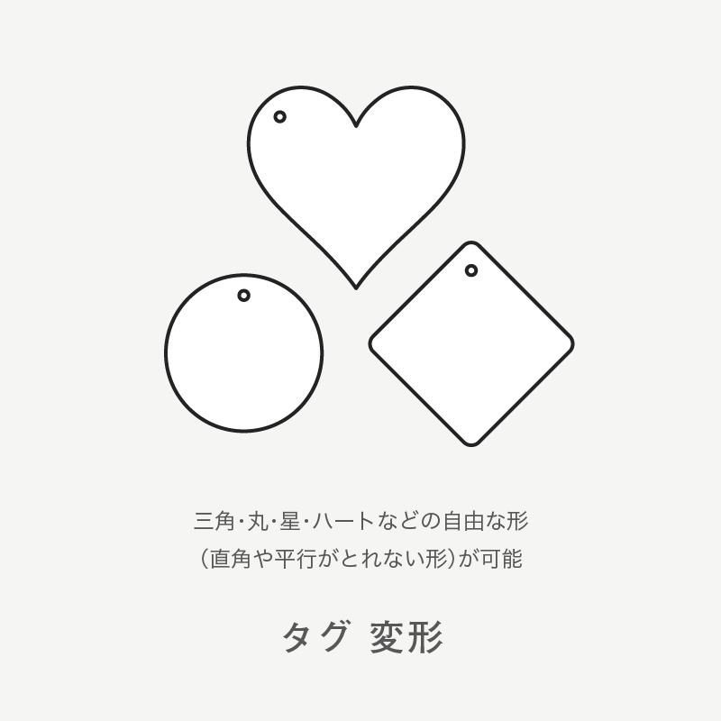 [タグの種類] 変形(ダイカット型)※三角・丸・星・ハートなど、直角や平行がとれない自由な形が可能