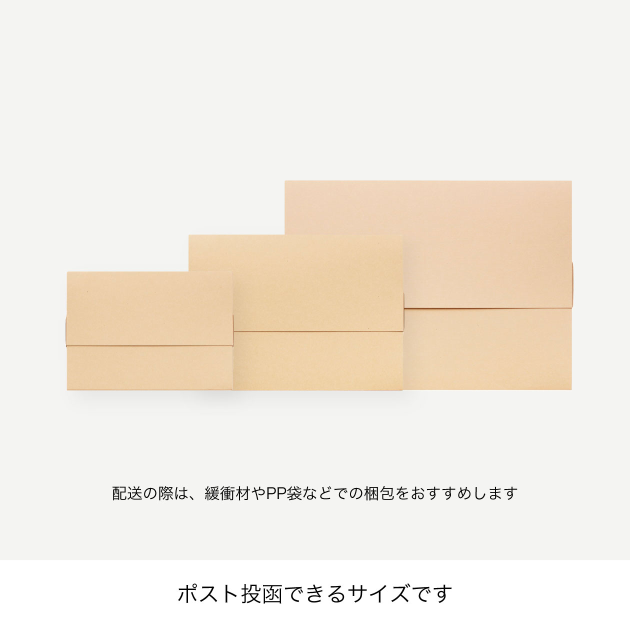 タトウ式箱差込サイドは、両サイドを差込んで組み立てるパッケージです。平らな状態でお届けし組み立ててお使いいただくため、保管場所をとりません。22mmのマチがあるので、パンフレットなどの薄物の書類や商品を収納できます。ポストに投函することも可能です。配送の際は、商品保護のため緩衝材やPP袋などでの発送用梱包をおすすめします。