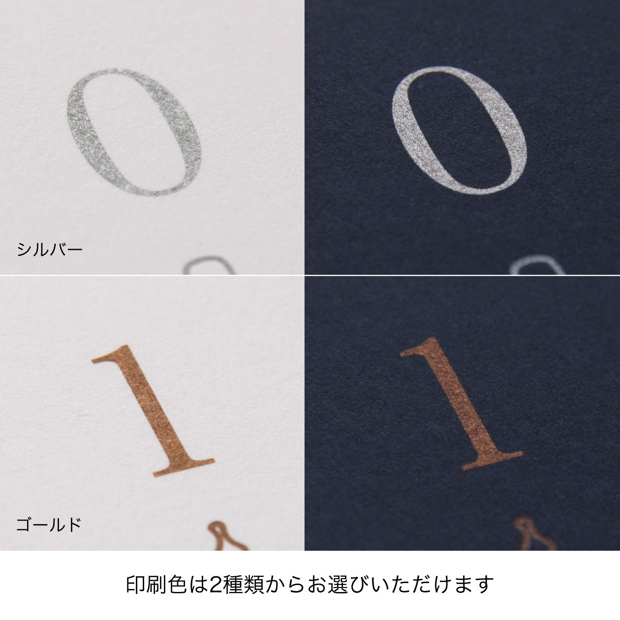 風合いのあるBasicや深い色合いのColorsの紙にゴールドやシルバーの活版印刷を施すことで、品のある美しい仕上がりになります。紙素材は4種類、印刷色は2種類からお選びいただけます。