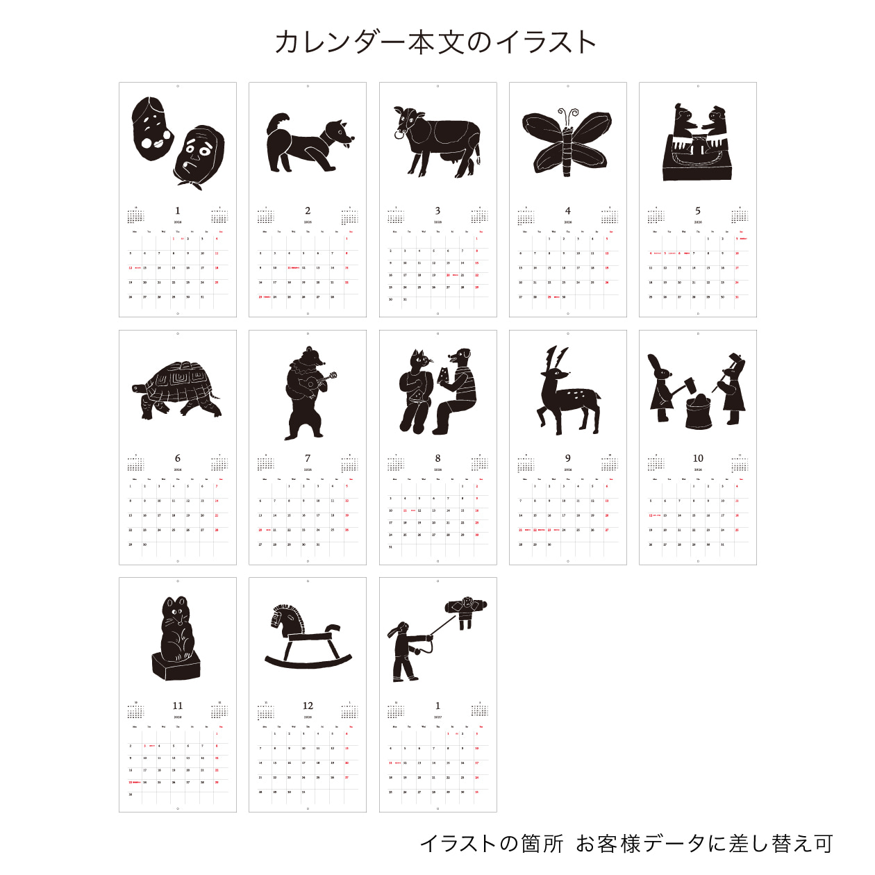 お客様のイラストや写真をお送りいただくだけで、簡単にオリジナルカレンダーが作成できます。