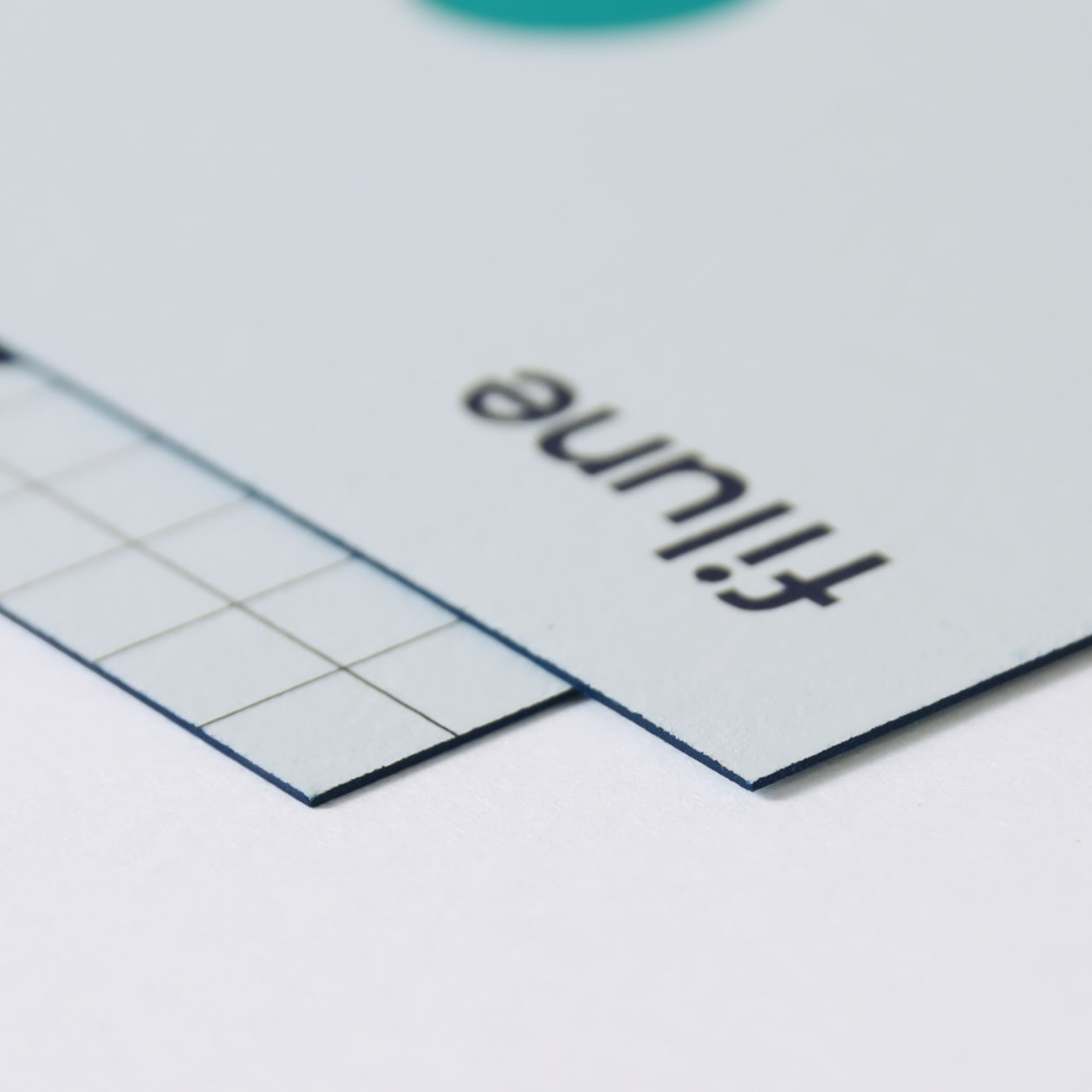 サロン内に置かれているタイル地の特注インテリアの意匠を引用しながら、ロゴ部分にエンボスをかけることで、ネイビーのラインに埋もれず、触覚にも楽しいショップカード。