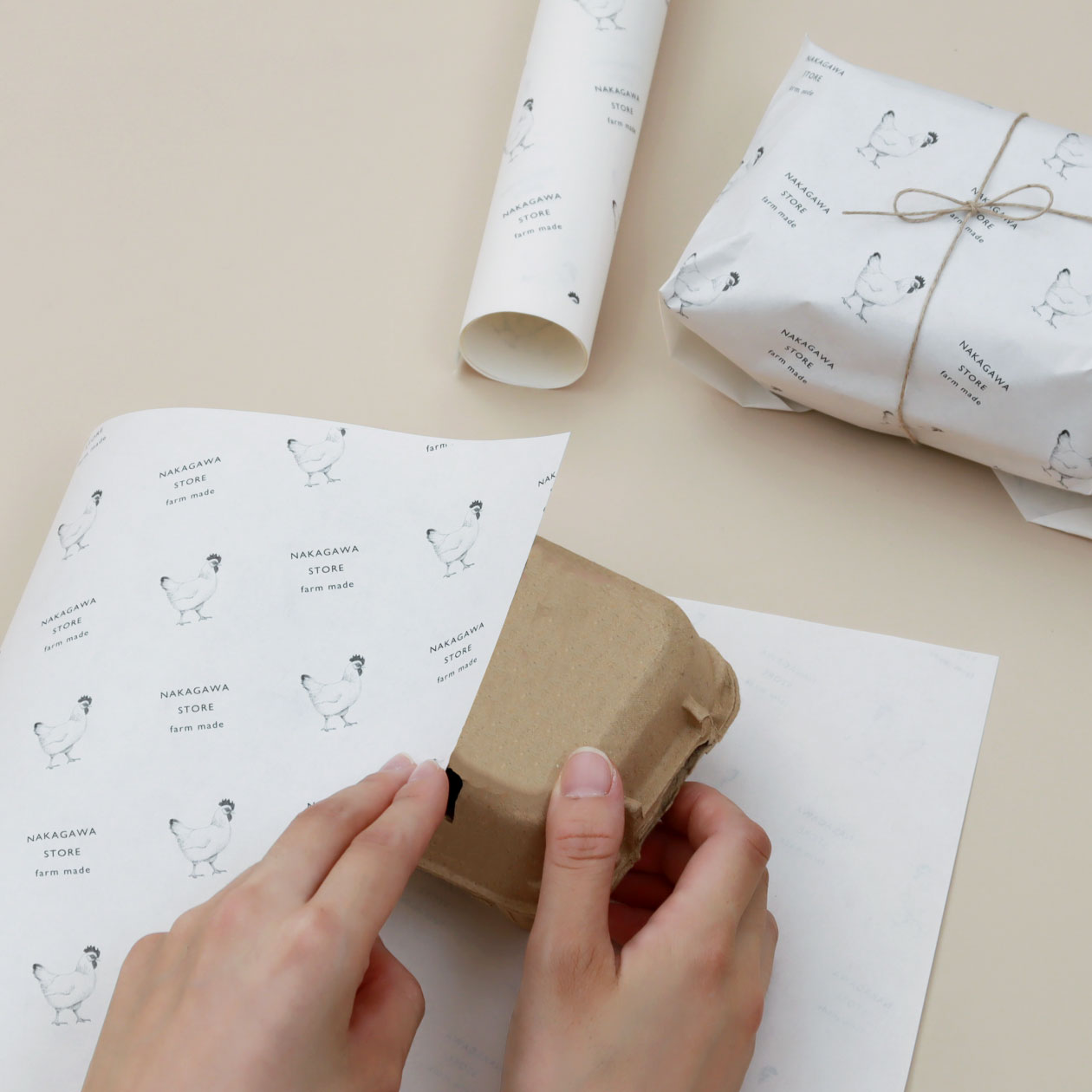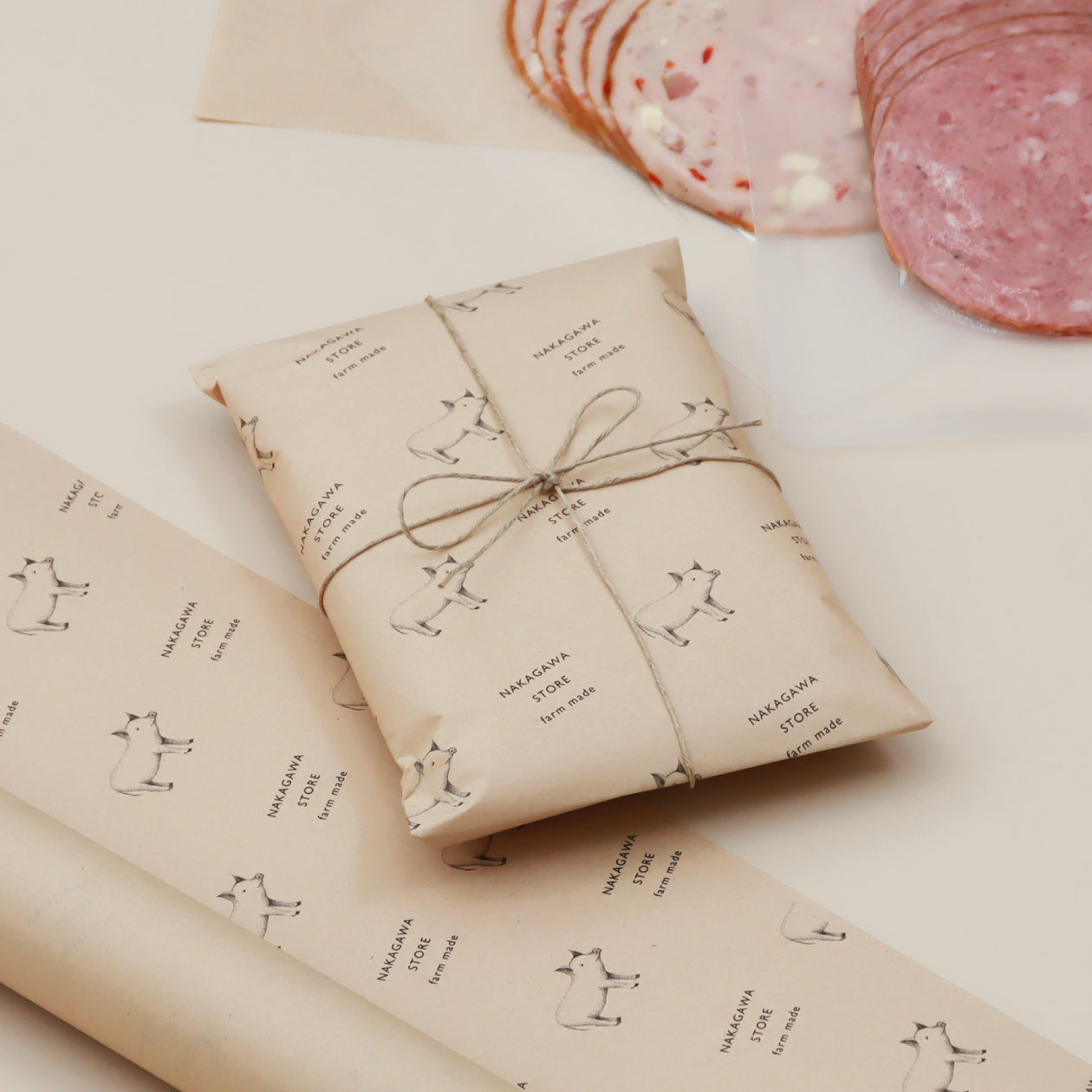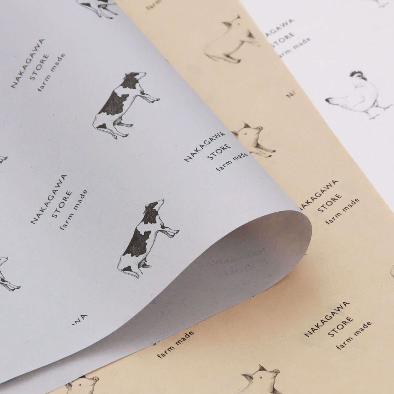 牛・豚・鶏のイラストとお店のロゴをあしらった、パターン柄の包装紙。食材モチーフとロゴが繰り返されるデザインは、包むだけで楽しい雰囲気を演出します。クラフト感のある薄い紙素材を使用しているため、さまざまな形やサイズに対応でき、店頭での簡易包装やギフトラッピングにも便利です。