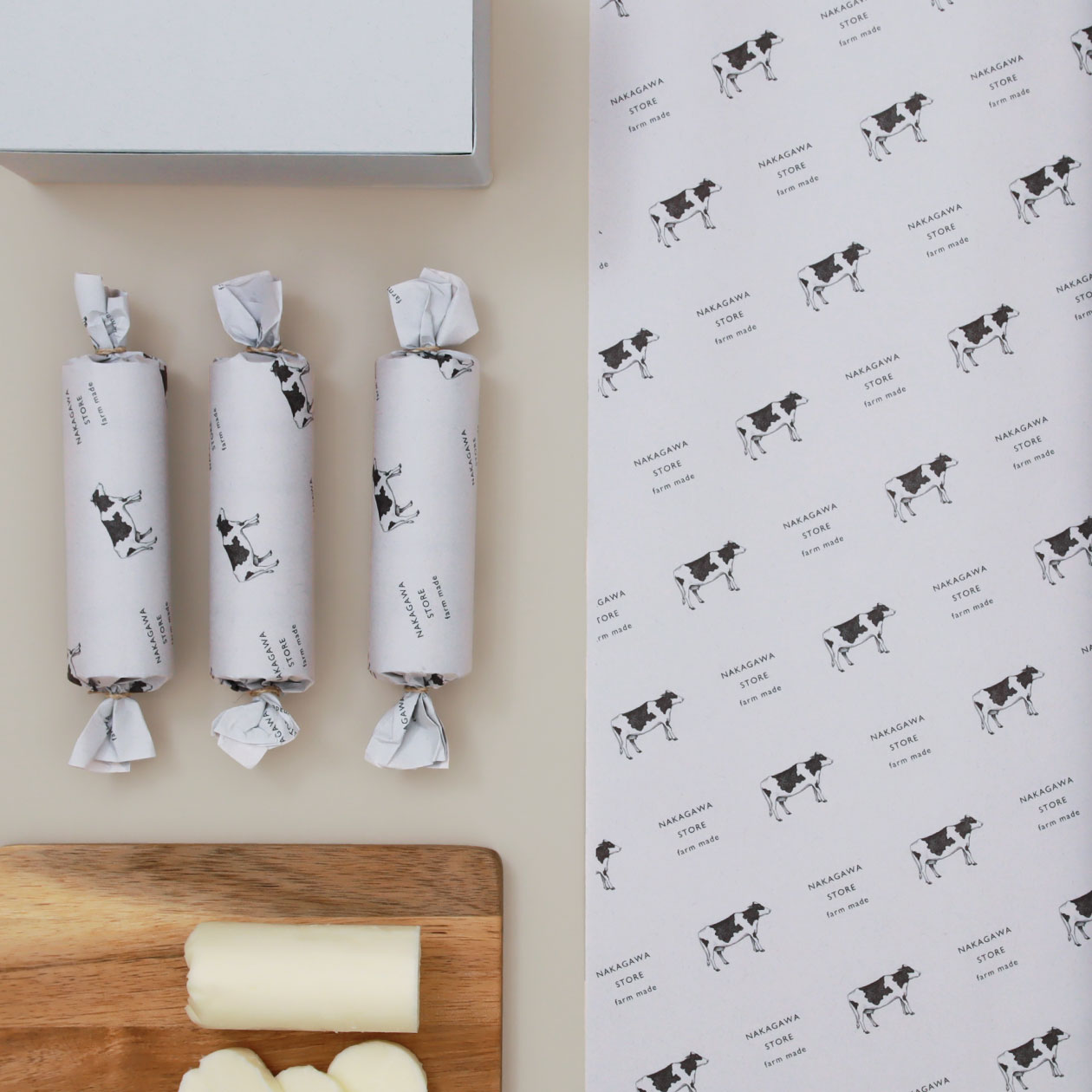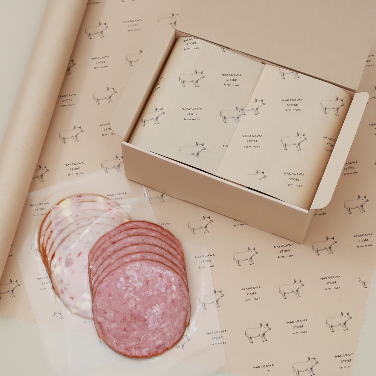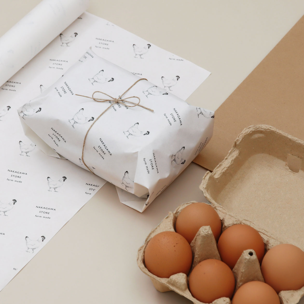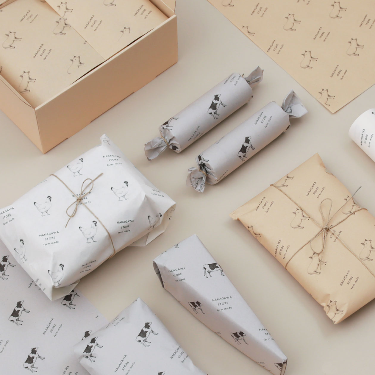 牛・豚・鶏のイラストとお店のロゴをあしらった、パターン柄の包装紙。食材モチーフとロゴが繰り返されるデザインは、包むだけで楽しい雰囲気を演出します。クラフト感のある薄い紙素材を使用しているため、さまざまな形やサイズに対応でき、店頭での簡易包装やギフトラッピングにも便利です。