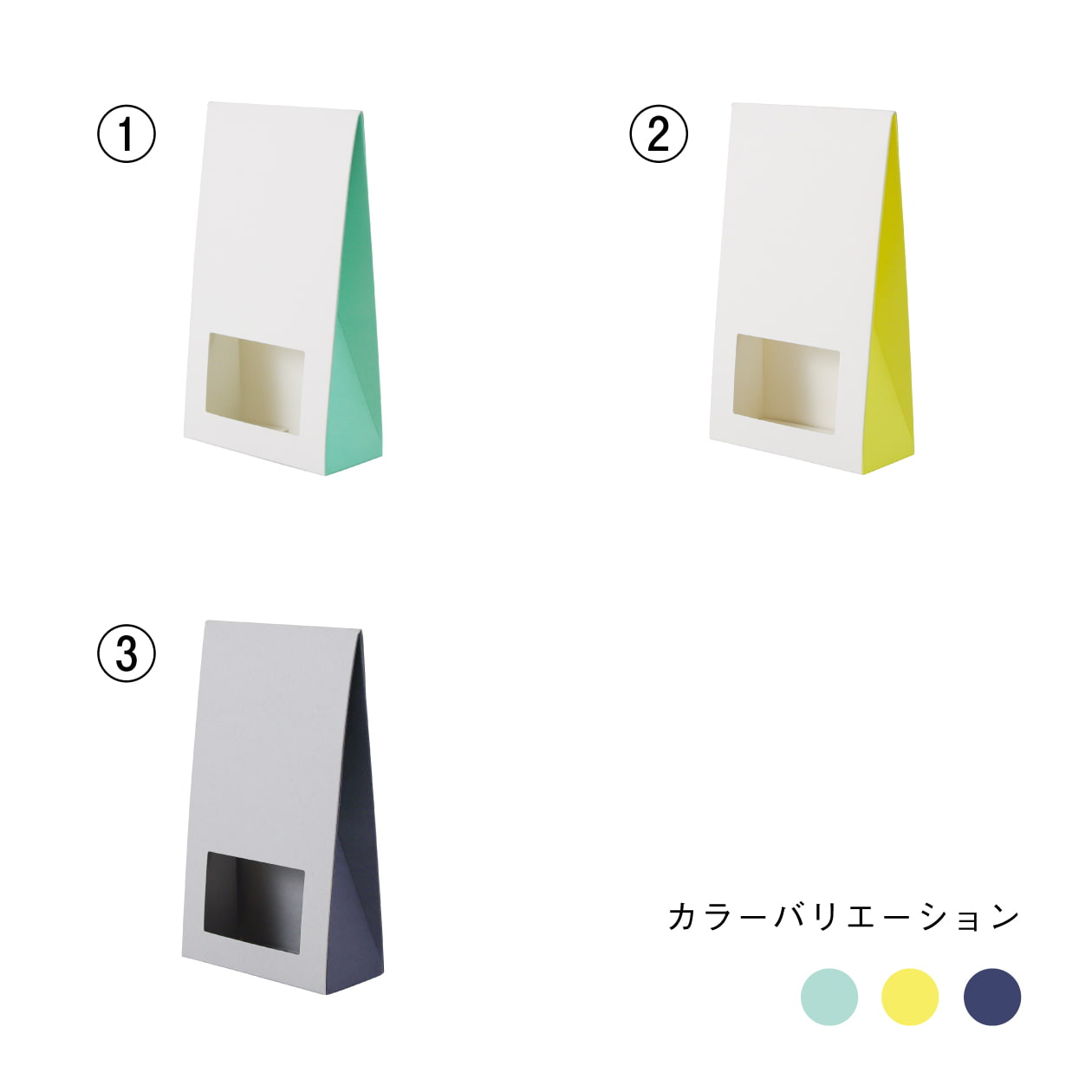 側面カラーが印象的な角底箱。窓付きで中の商品が見えるため、ソックスやハンカチなどの小物雑貨、特産品やお菓子のパッケージにぴったり。立ててディスプレイもでき、シールデザイン次第でぐっとおしゃれになります。