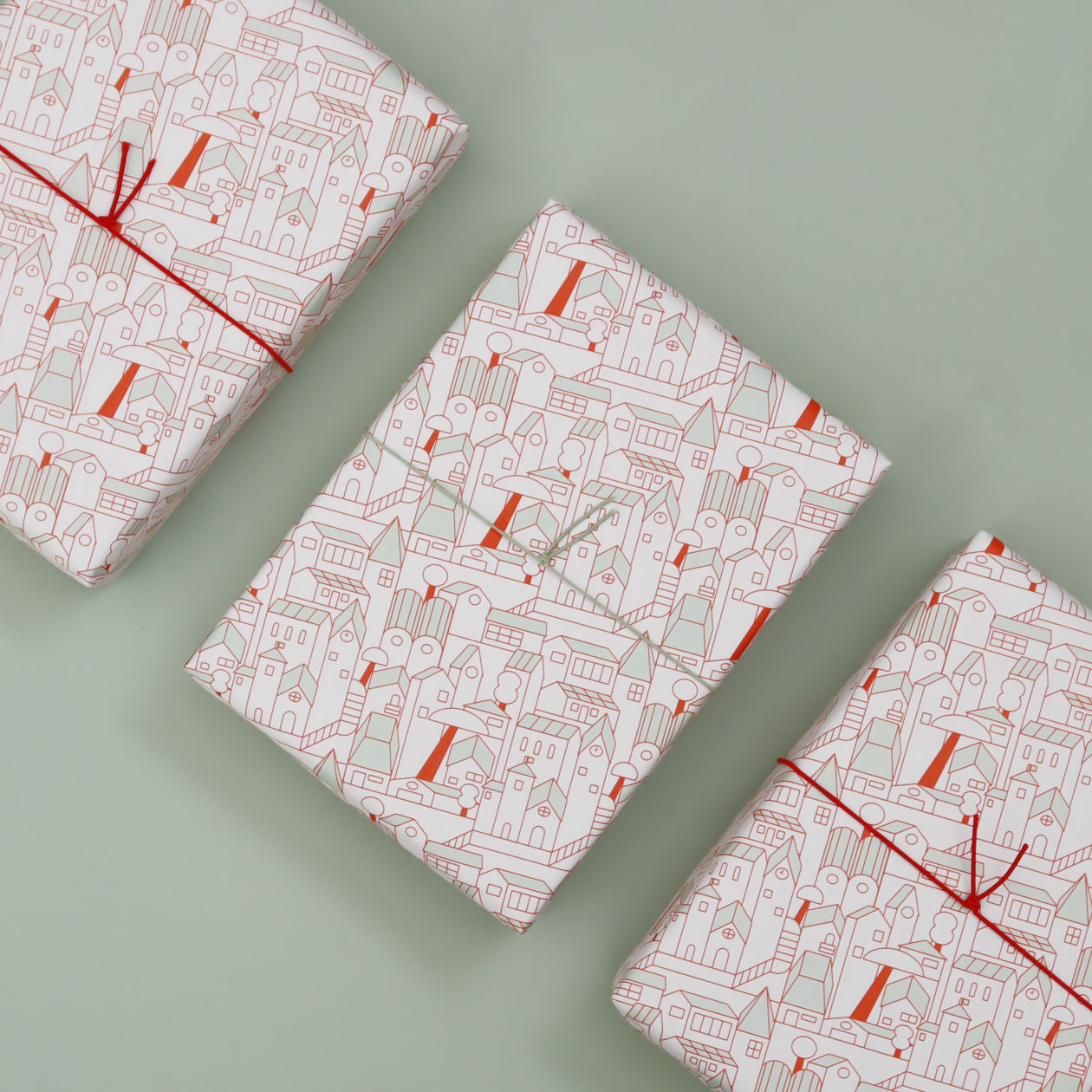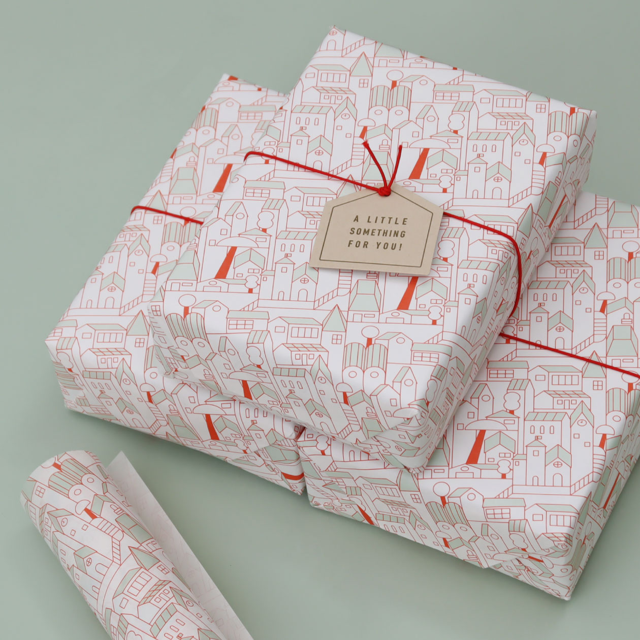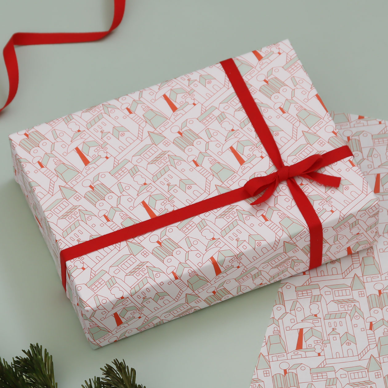 ブロックのような街並みがポップで楽しいラッピングペーパー。淡いグリーンと赤のクリスマスカラーで贈り物を華やかに彩ります。