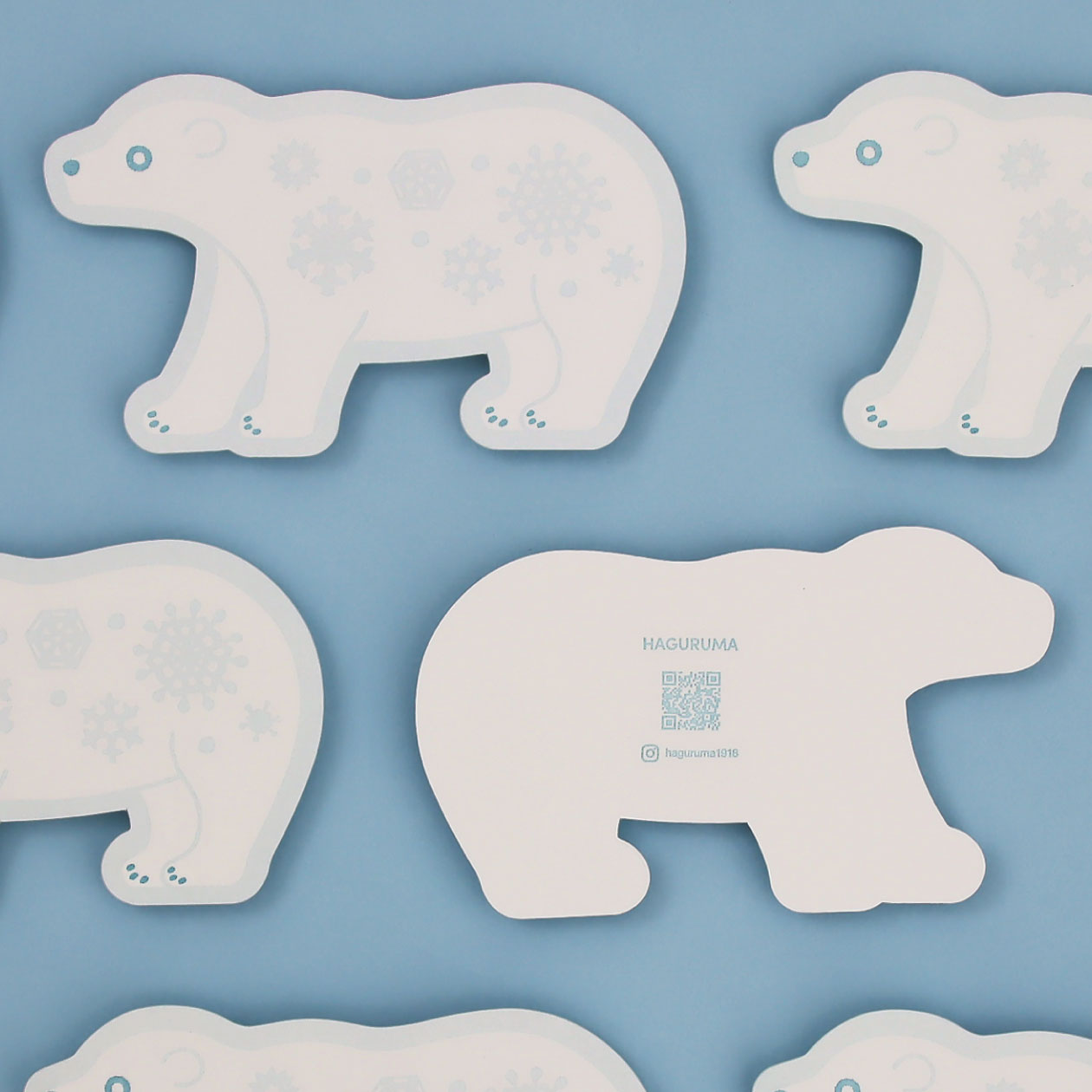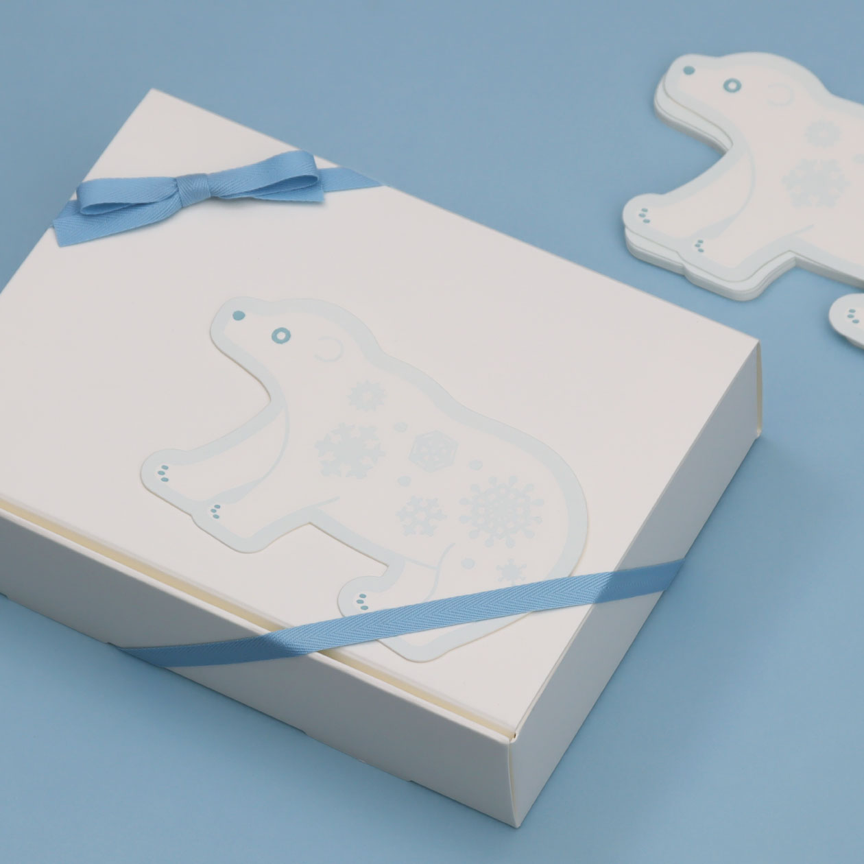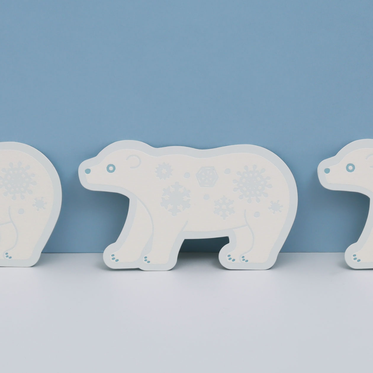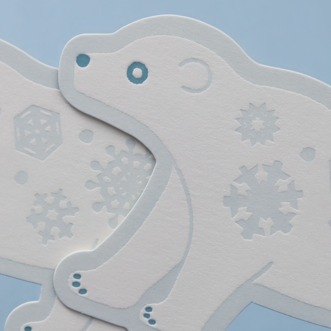 イラストに合わせてくり抜いた、 活版印刷のダイカットカード。輪郭と雪の結晶を淡いブルーの活版印刷で刷ることでシロクマが浮かび上がり、冬の静かな雰囲気を表現しています。イラストの形に沿ってダイカット加工を施し、モチーフがより引き立つデザインに。 印象に残るショップツールやディスプレイとして、またお客様へお渡しして、飾って楽しんでいただくアイテムとしてご活用いただけます。