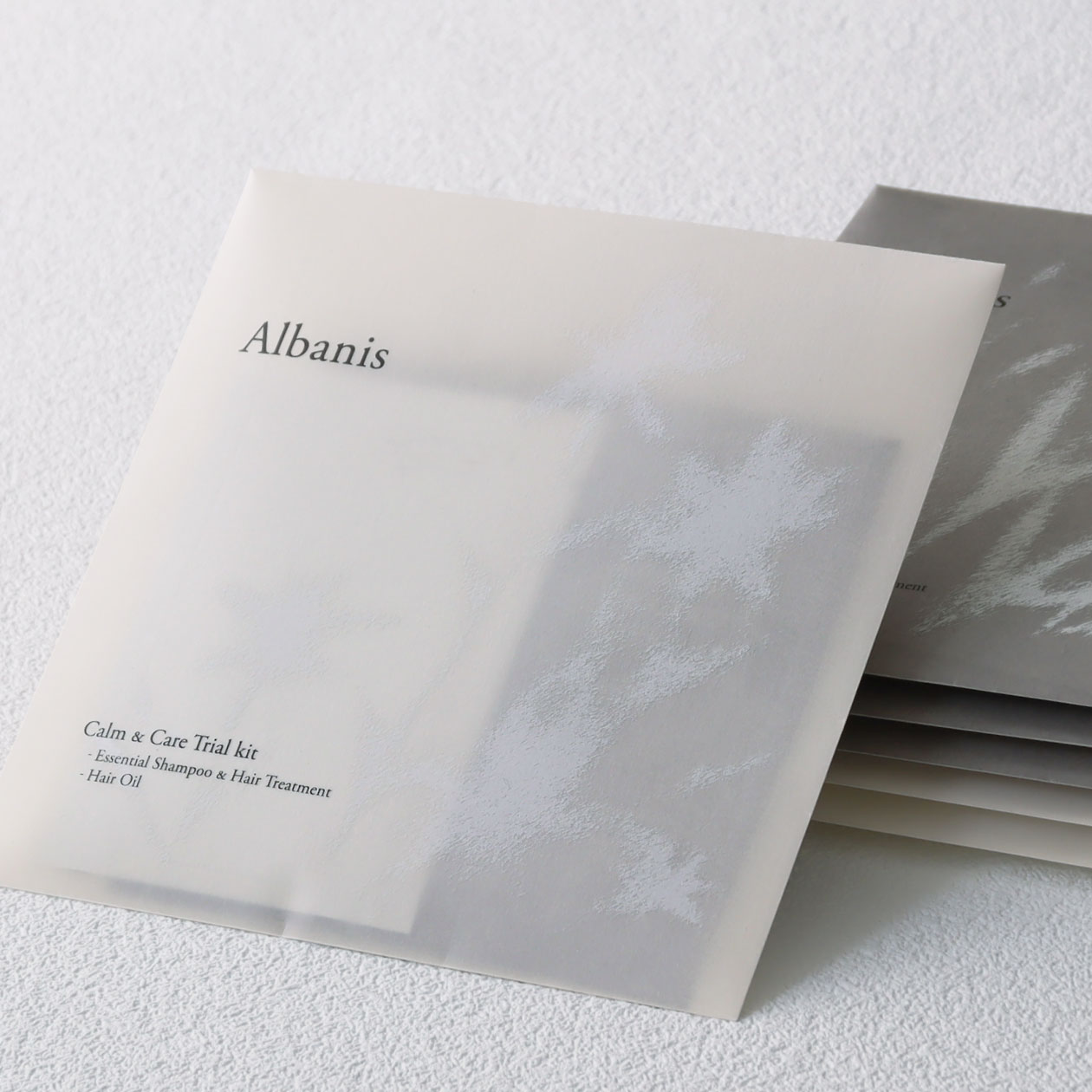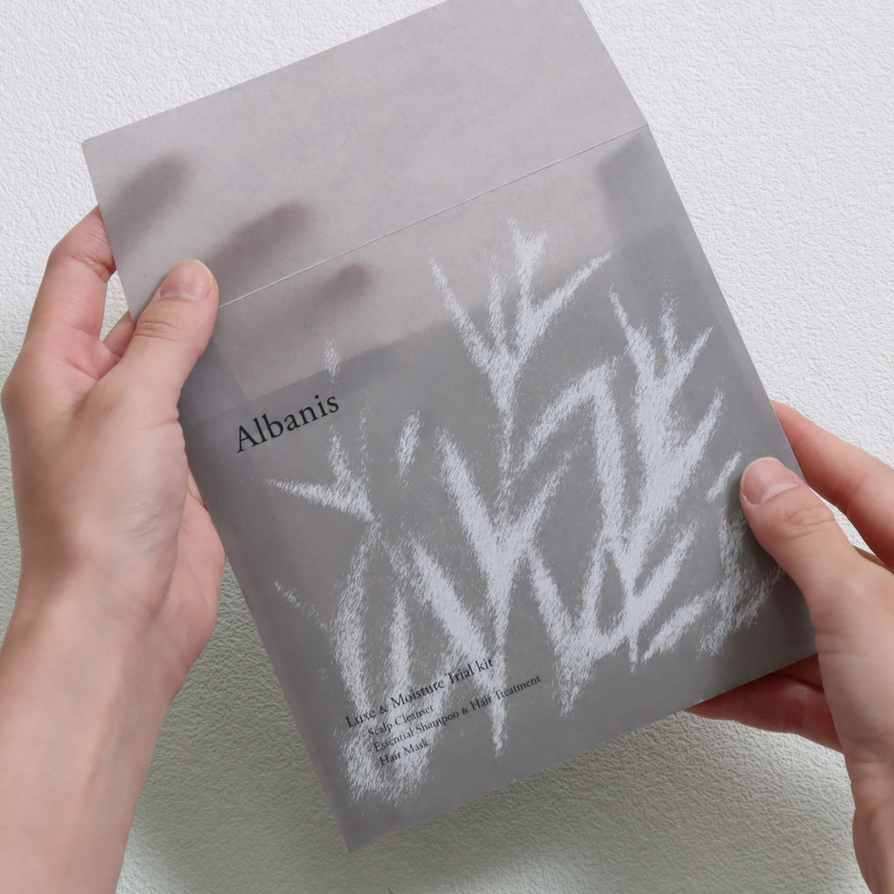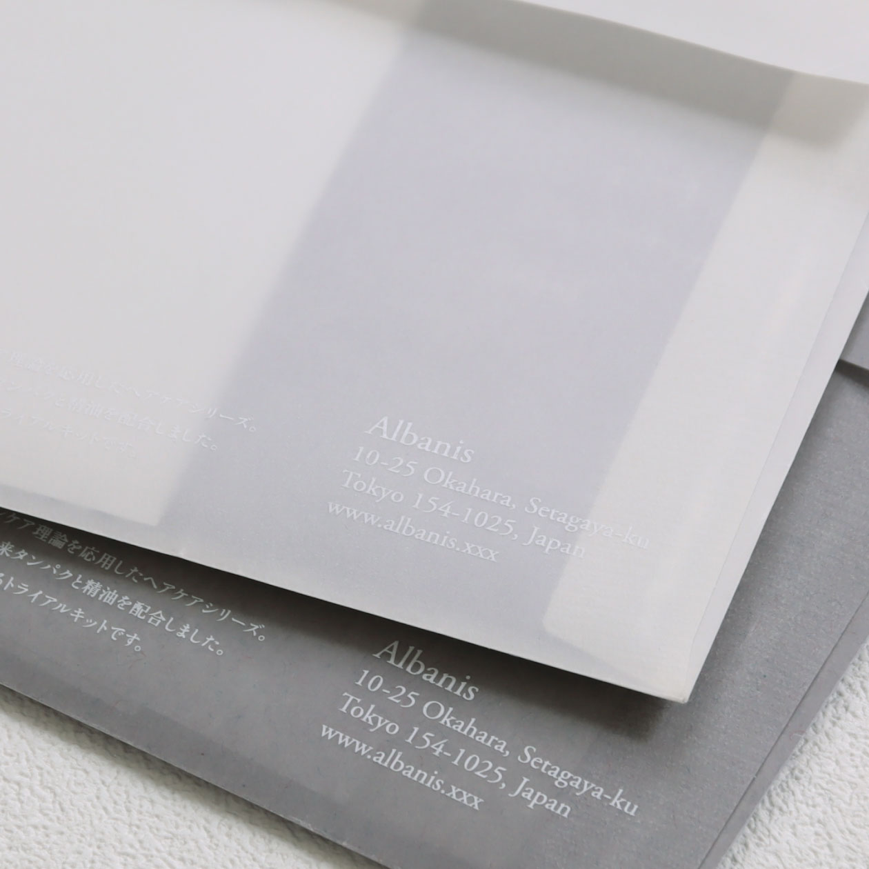 ヘアサロンで販売するトライアルキットのパッケージ封筒。ロウ引き加工による控えめなツヤと程よい透け感が上品な印象を与えます。デジタルホワイトの印刷でモチーフを印刷することで、サロンの雰囲気になじむ繊細な仕上がりです。リボンをかけて封をするだけで、ギフトパッケージとしてもご使用いただけます。
