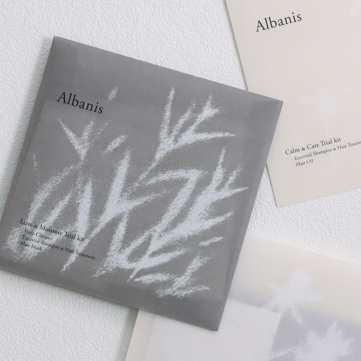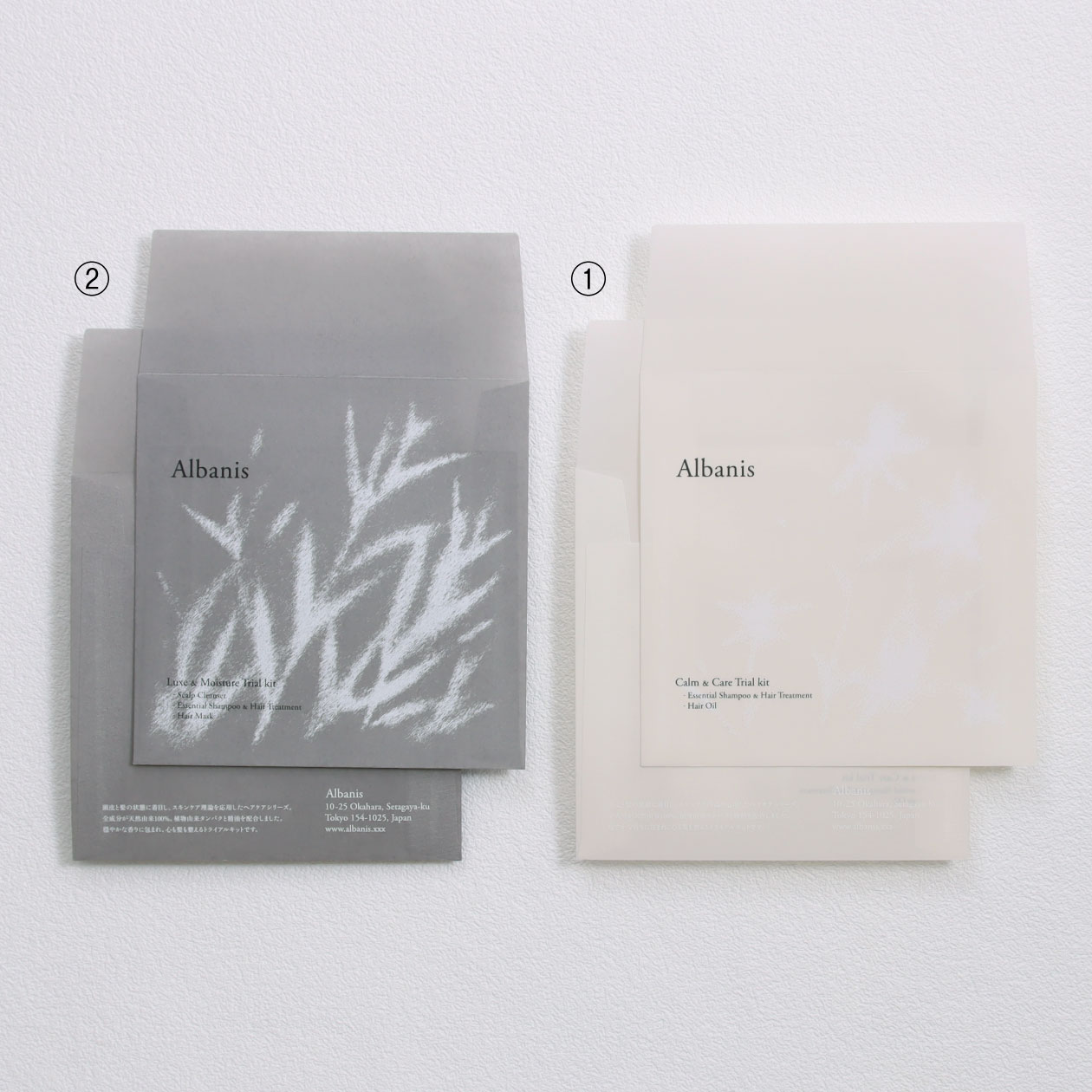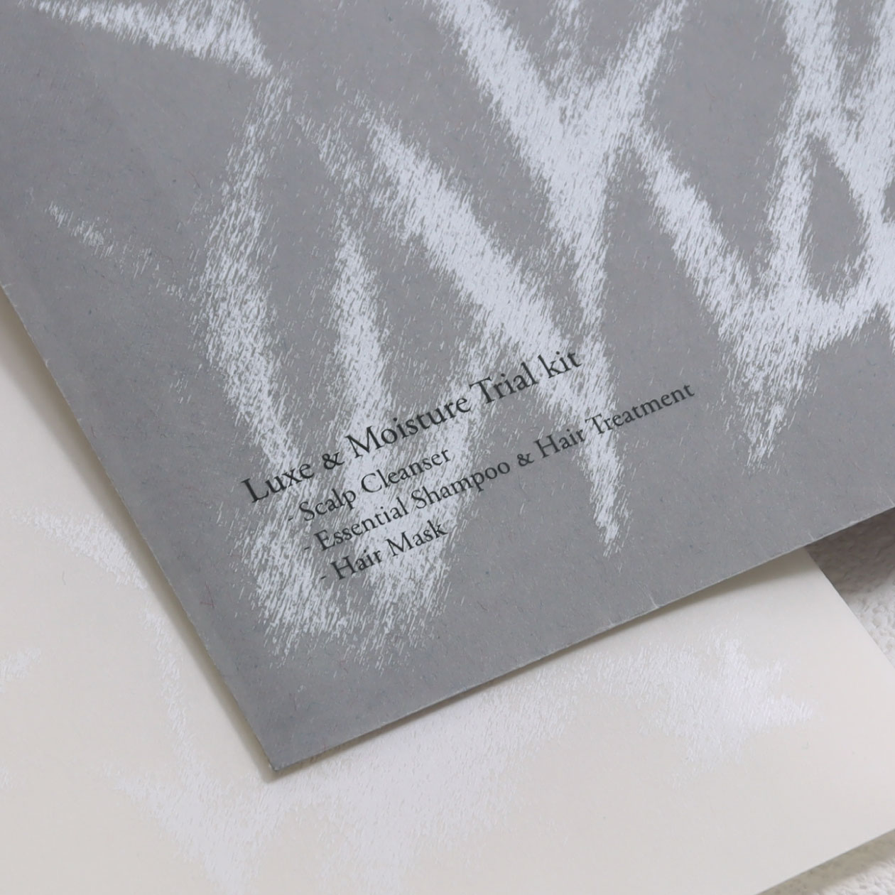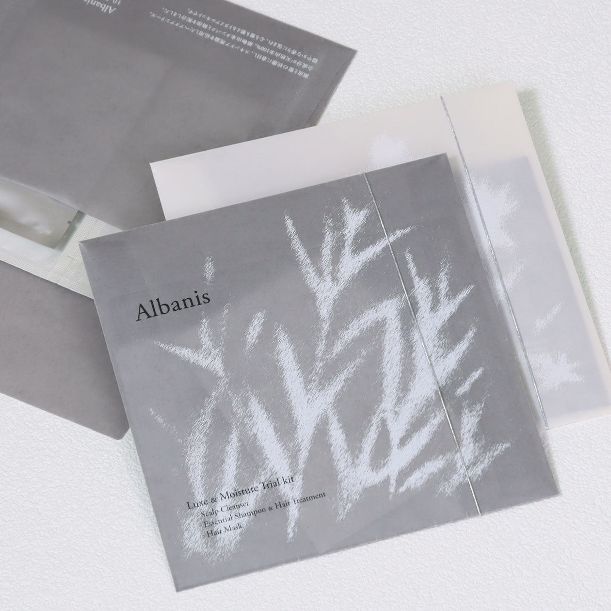 ヘアサロンで販売するトライアルキットのパッケージ封筒。ロウ引き加工による控えめなツヤと程よい透け感が上品な印象を与えます。デジタルホワイトの印刷でモチーフを印刷することで、サロンの雰囲気になじむ繊細な仕上がりです。リボンをかけて封をするだけで、ギフトパッケージとしてもご使用いただけます。