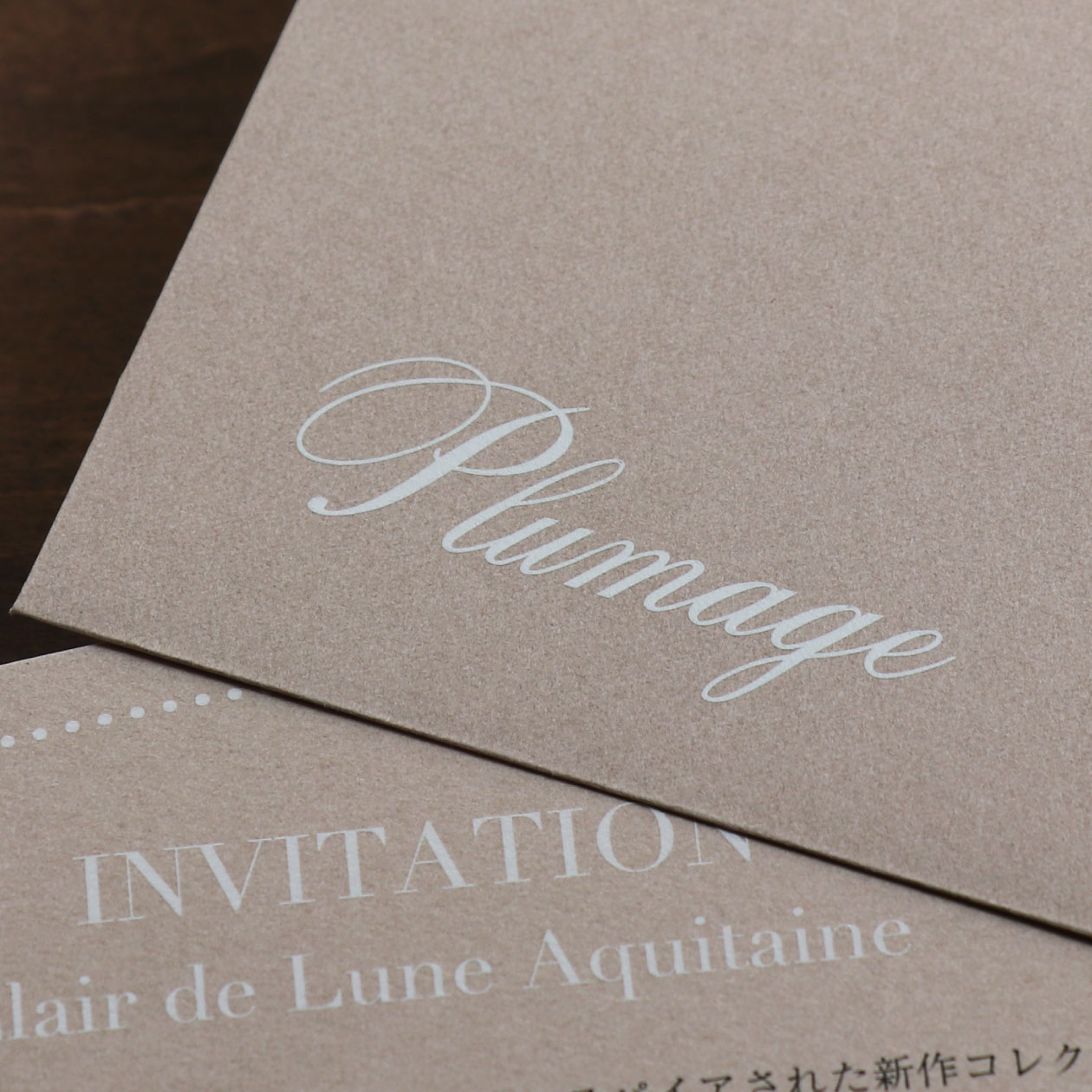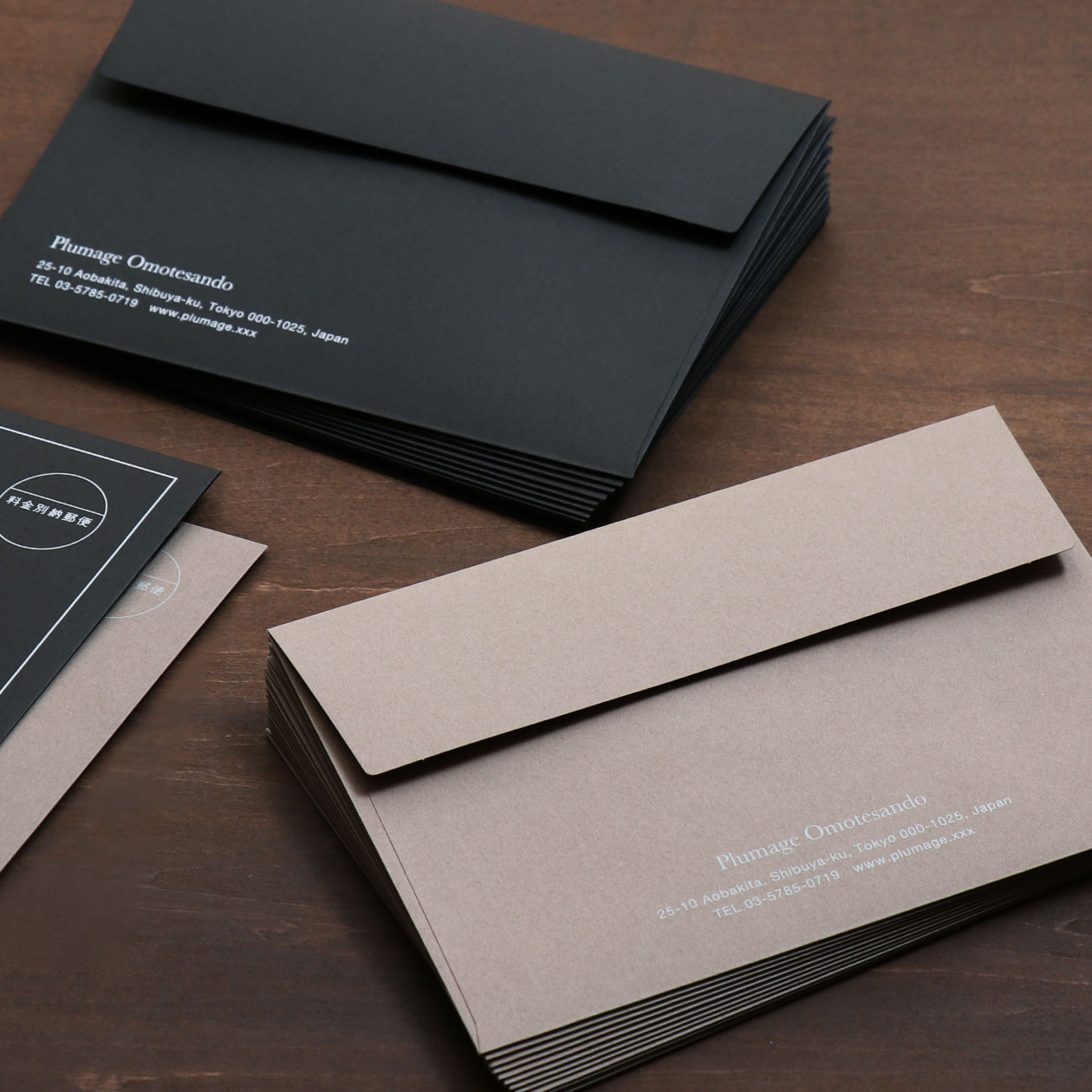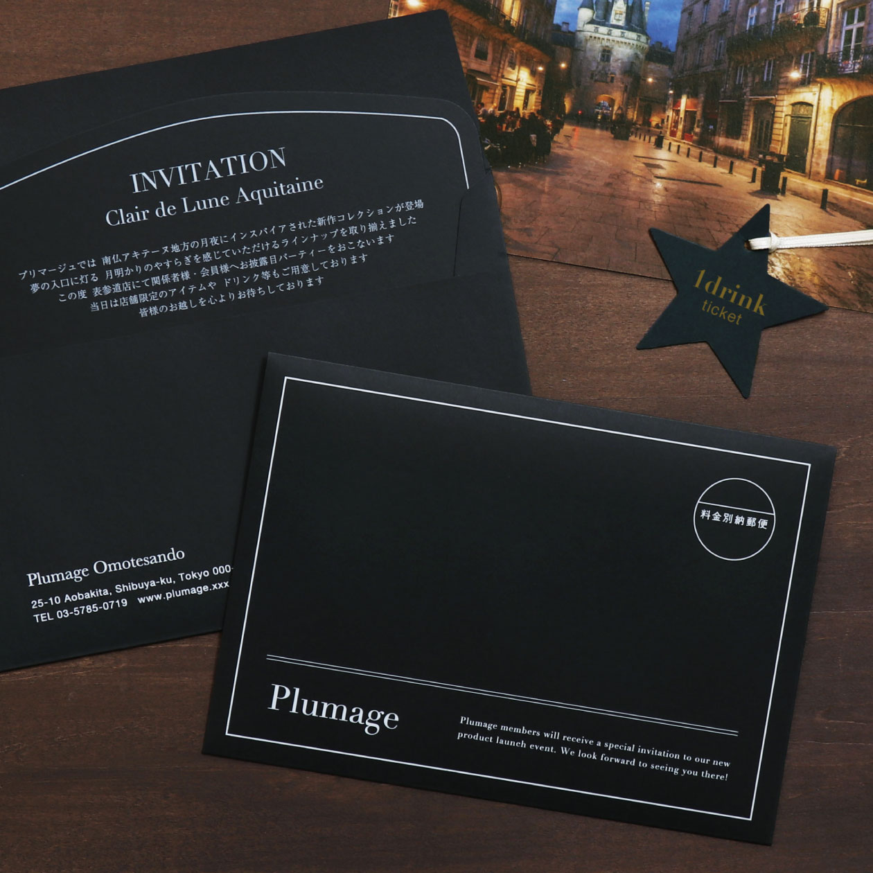 深い色合いのColorsシリーズの紙に、デジタルホワイトで印刷した封筒とカード。 クラシカルな形のカードと組み合わせることで、スタイリッシュで上品な印象に仕上がります。 ノベルティやチケットを同封すると、開封時のわくわく感やブランドの世界観がより伝わります。