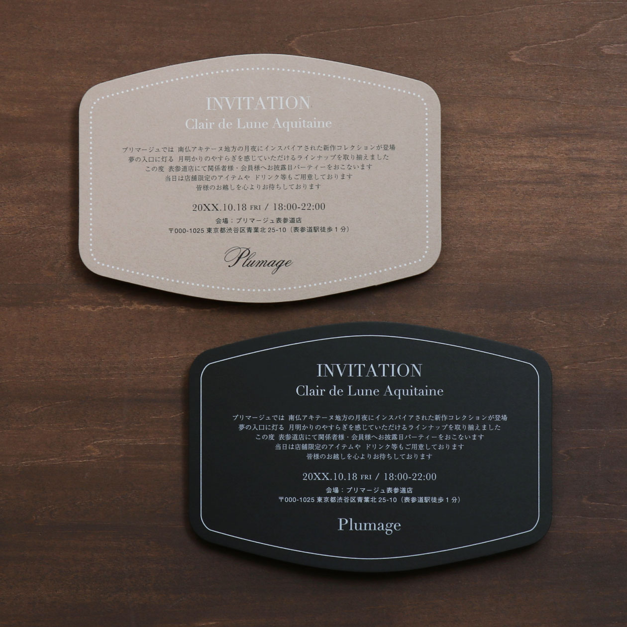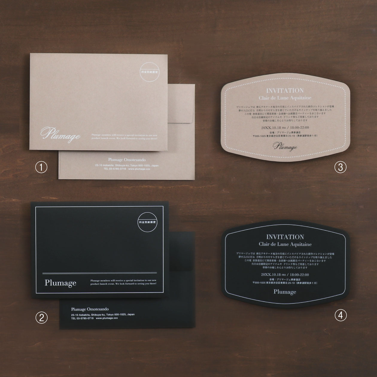 [検索タグ] 封筒 Colorsグレージュ Colorsマットブラック デジタル印刷 カード ダイカット加工 案内状 コスメブランド 注文できるデザイン