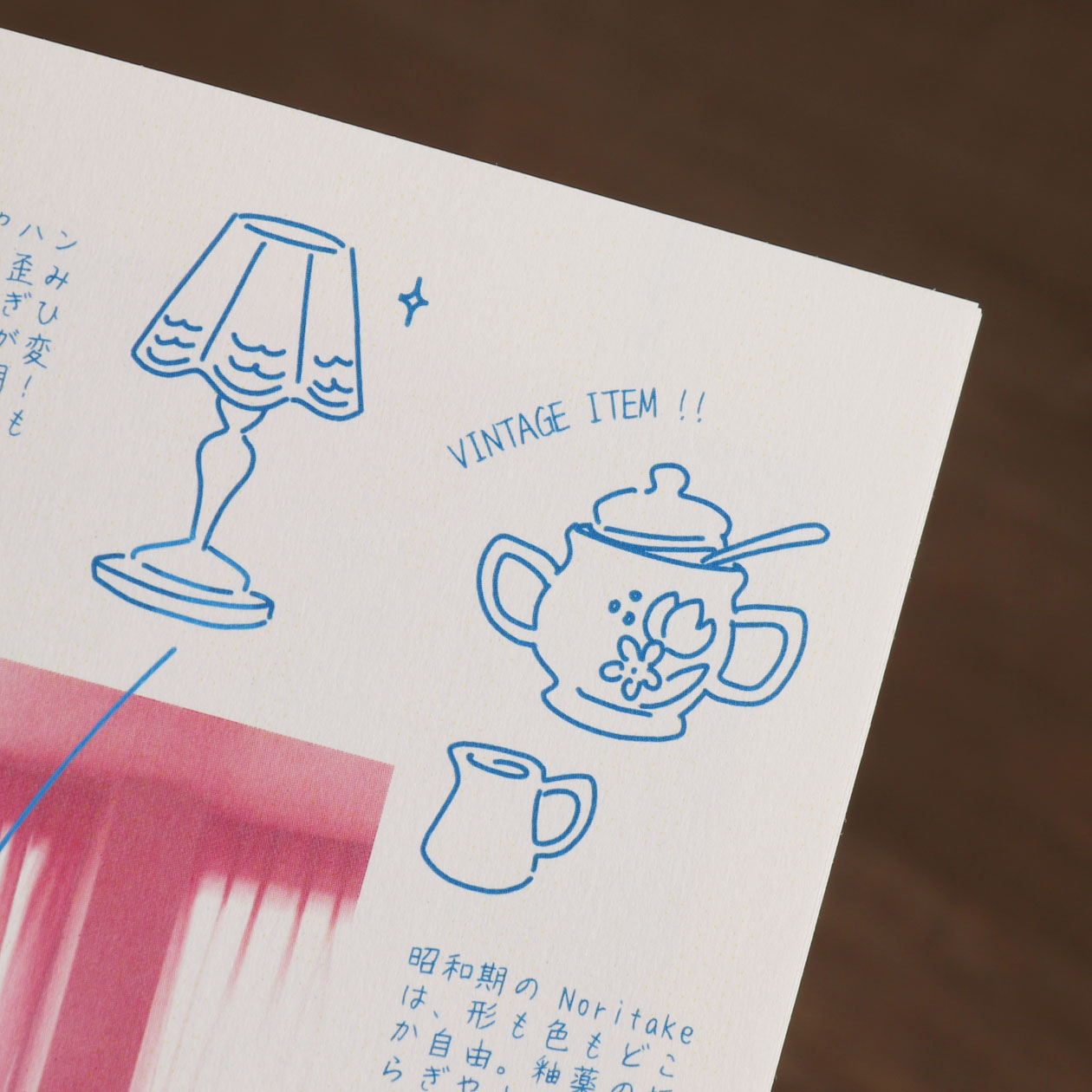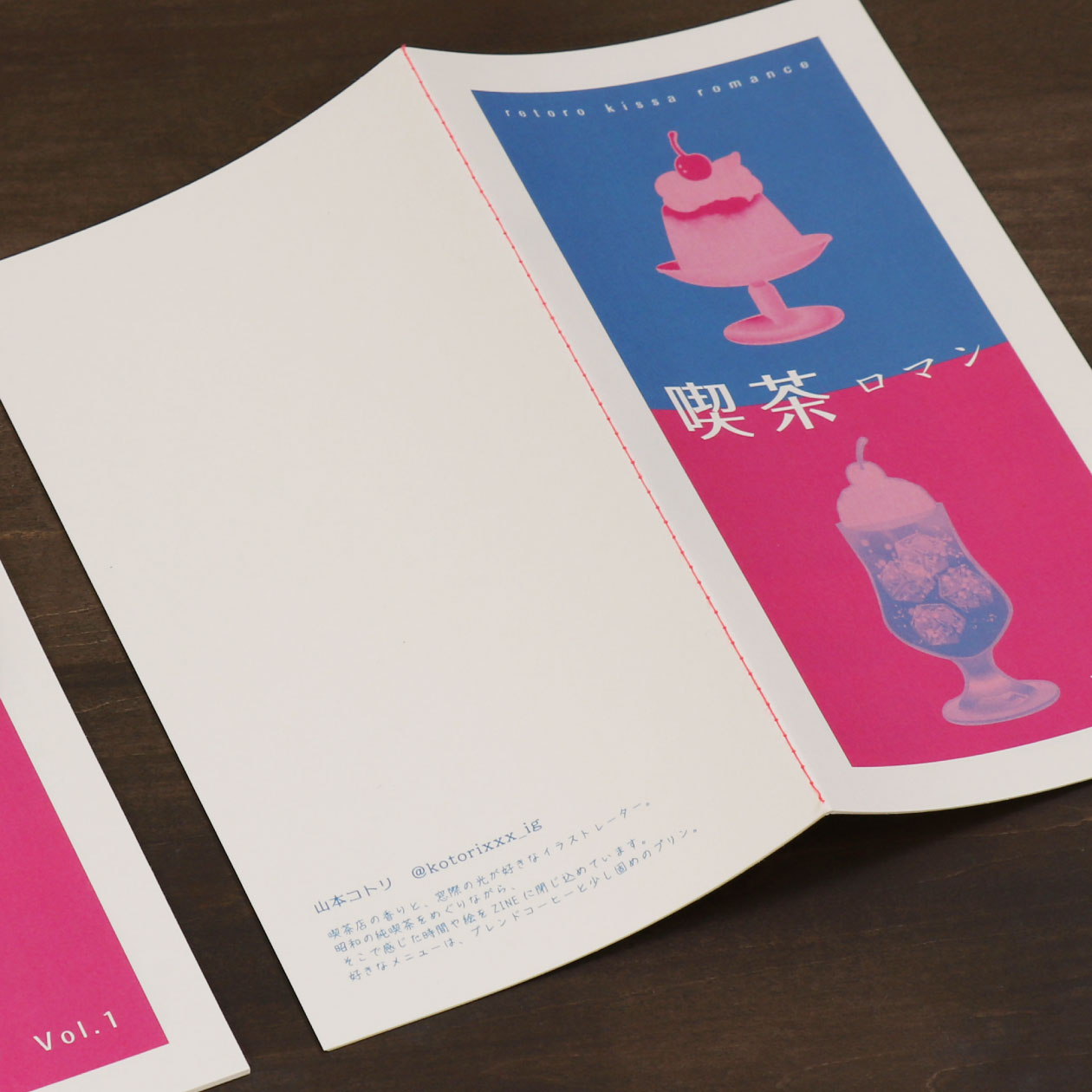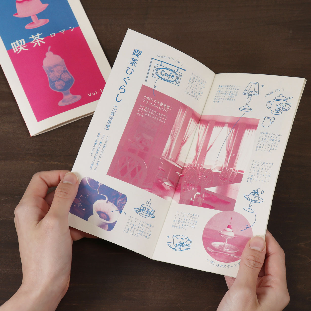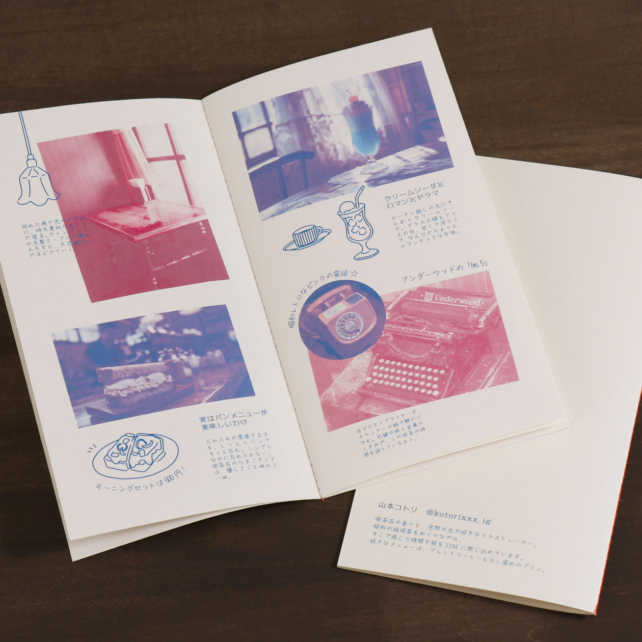 レトロな雰囲気に仕上げたZINE。フルカラー印刷でありながら、あえて2色印刷風の仕上がりになるようにデザインしています。 縦長のフォルムは、ポケットやバッグにも収まりやすいサイズ感。ガイドブックのように持ち歩きしやすく、気軽に開ける一冊です。