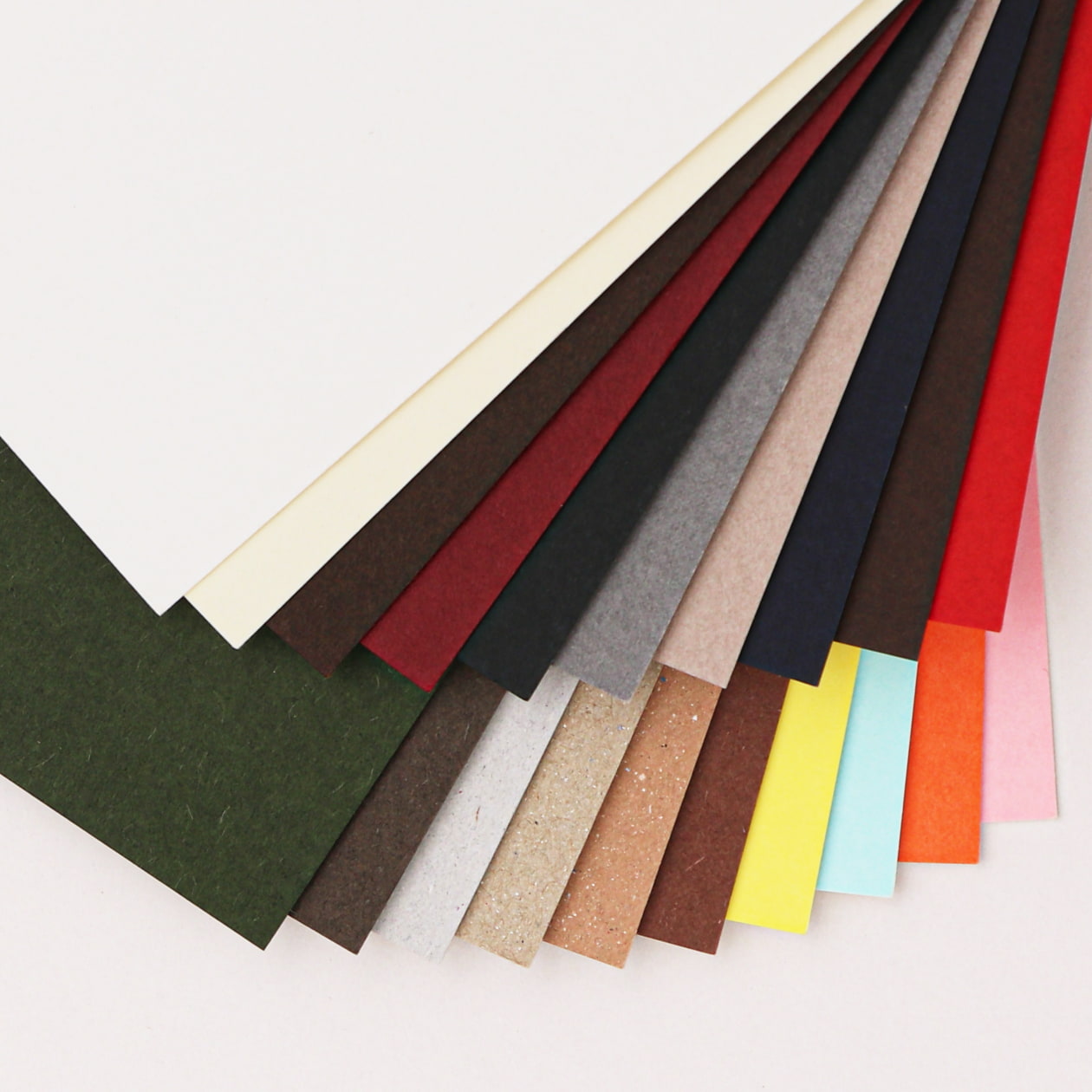 ※ボード紙ストーングレイ/ボード紙ブラウン/ボード紙チョコレートは、紙の性質上、光(外光・室内光)にあたると退色しやすいため、暗所で保管してください。また原材料に再生古紙を多く含むため、異物の混入や生産ロットにより色目に違いが生じます。