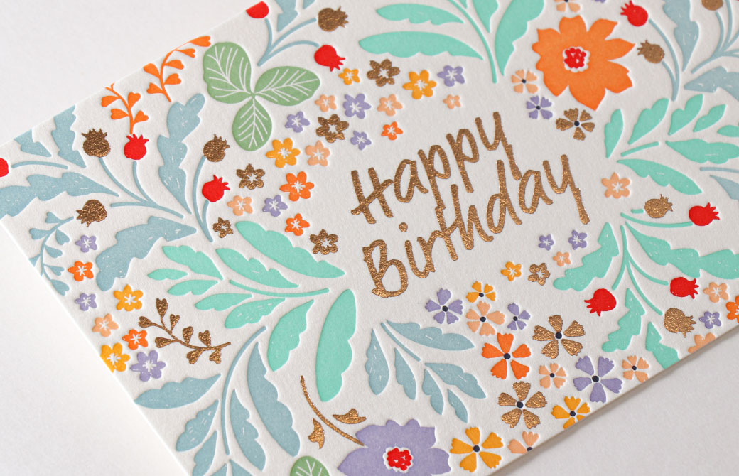 豪華な8色の多色活版印刷で仕上げたバースデーカード。上顧客やVIP会員への贈り物として、より贅沢な印象を演出します。活版印刷ならではの凹凸のある手触りが特別感を引き立てます。さらに、タイトルや全体に箔押しをあしらい、きらびやかで華やかな仕上がりに。