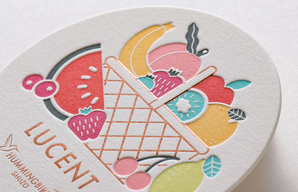 カラフルな多色活版印刷で仕上げた、新商品ワインのローンチ用のノベルティコースター。テーブルを華やかに彩るだけでなく、飾ってアートとしても楽しめます。活版印刷ならではの凹凸と色の重なりが、手に取るたびに特別な印象を与えます。華やかで印象的なオリジナルノベルティをお作りいただけます。