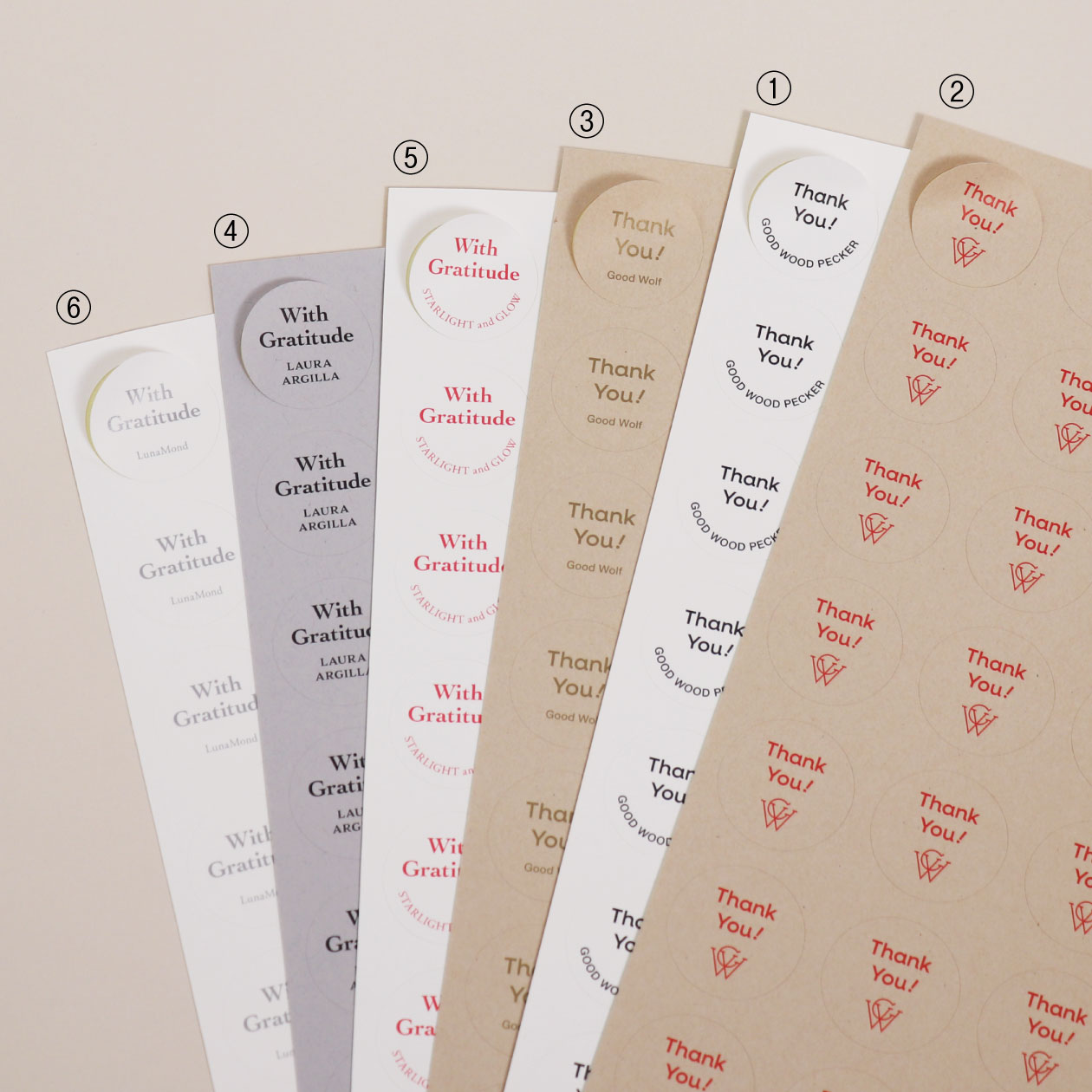 シンプルで使いやすいThank Youシール。ギフト用はもちろん、ロゴや社名を入れて、お客様への感謝を伝えるシールとしても活用できます。インナーペーパーの留めシールとして使えば、より丁寧で心のこもった印象に。書体はゴシック体と明朝体からお選びいただけます。ゴシック体はカジュアルでクラフト感のある雰囲気に、明朝体はクラシカルで上品な印象に仕上がります。Thank you 以外の自由なフレーズへの変更も可能。紙は3種類、印刷色は4色からお選びいただけます。