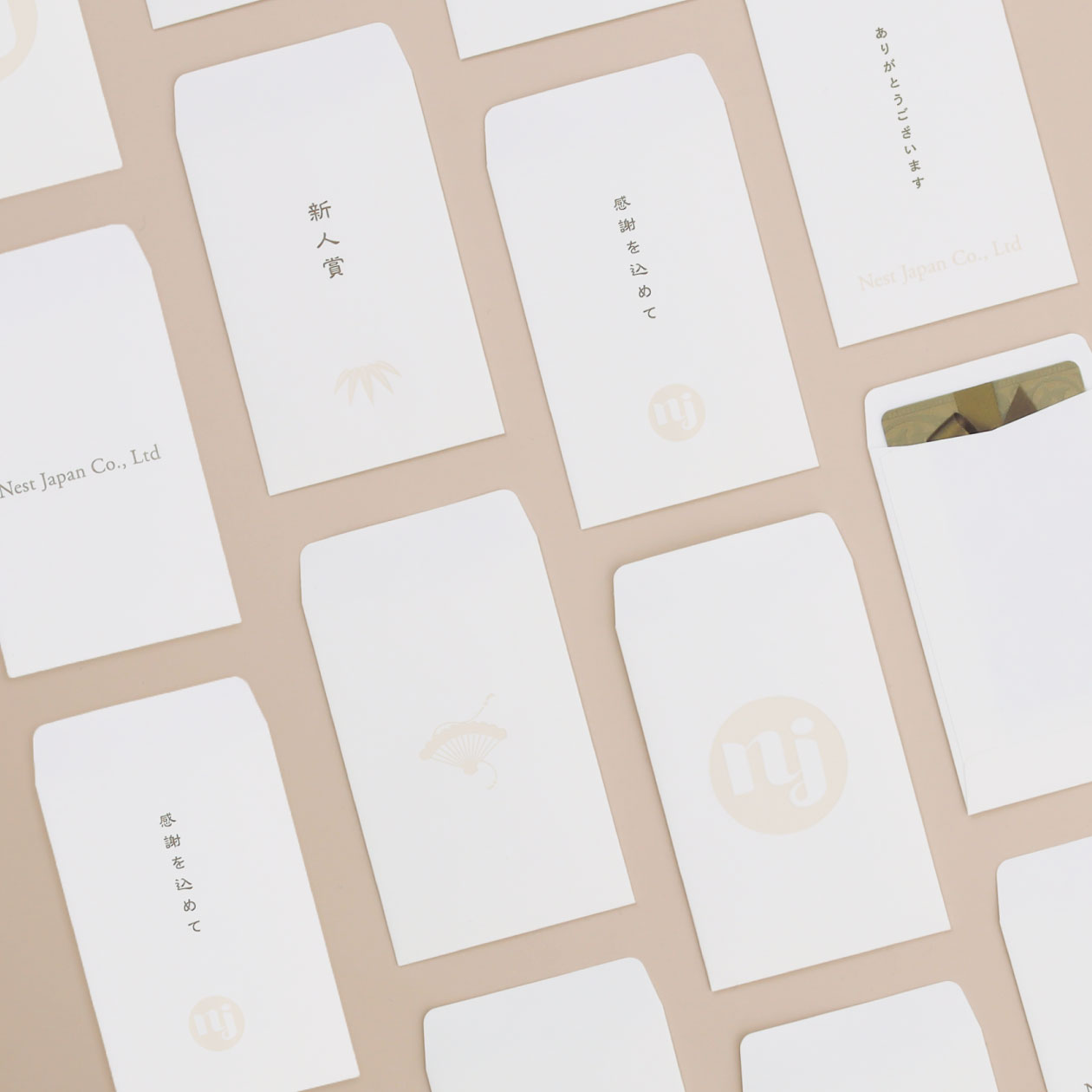 企業からお渡しするポチ袋。三つ折りのお札が入るサイズです。会社名やショップのロゴを入れたり、おめでたいモチーフのイラストに変更して作成することができます。印刷色は柔らかいクリーム色と、高級感のあるゴールドの2色をご用意。お年賀のポチ袋や、社内表彰のギフトカード用袋など、様々なシーンでお使いいただけます。デザインテンプレートを使用して、簡単に作ることができます。