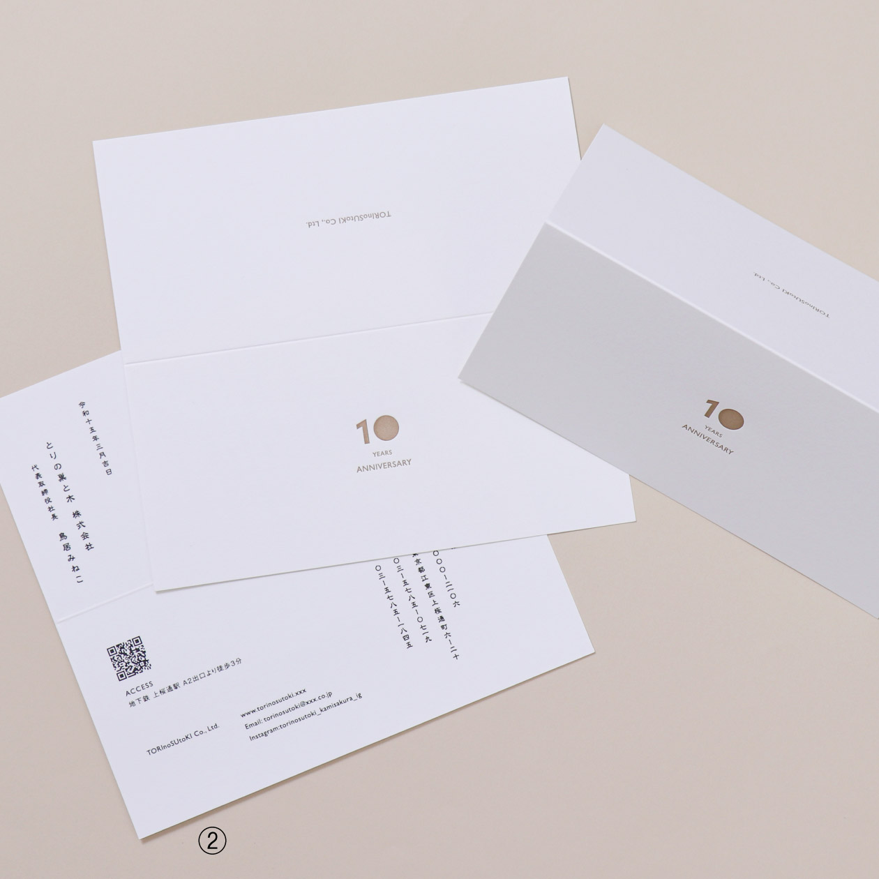 不動産会社の支店開業の案内状。二つ折りでフォーマルですが、少しスリムな形が目を引く案内状です。温かみのあるCottonの紙に活版印刷した小さなイラストが、柔らかで上品な印象を持たせます。イラストは、開業祝いにおすすめの「おうぎ」、新年のご挨拶状に「うめ」、10年以上の周年記念には「まつ」、10年未満であれば「七宝」や周年数を示すイラストを揃えました。用途によってお選びください。