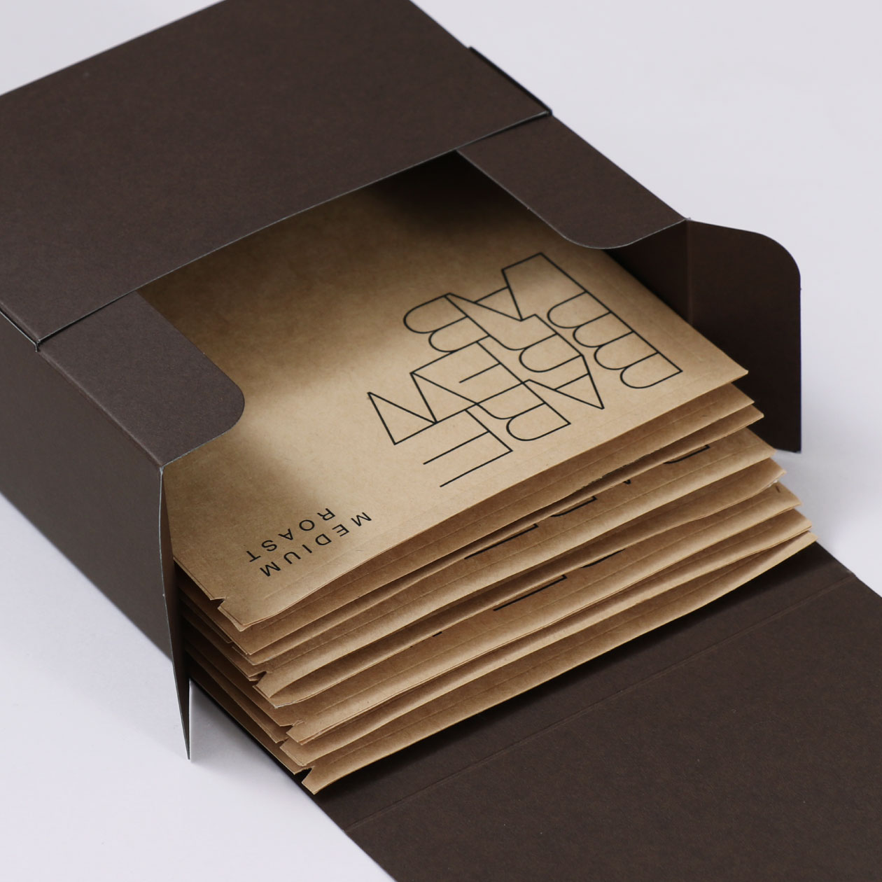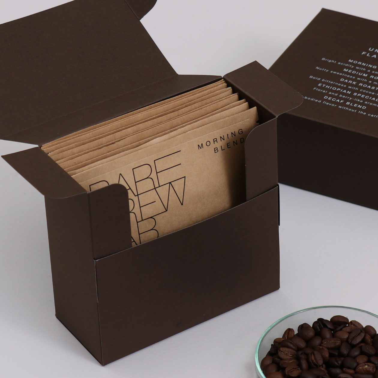 深く味わいのある色のColorsホットチョコレートの紙に、ホワイト印刷で表現したパッケージ。紙と印刷のコントラストが、モダンで洗練された印象を与えます。箱を立てたまま使えるため、中身も見やすく、店舗や自宅の空間をスタイリッシュに演出。コーヒーの魅力とブランドの世界観を引き立てます。