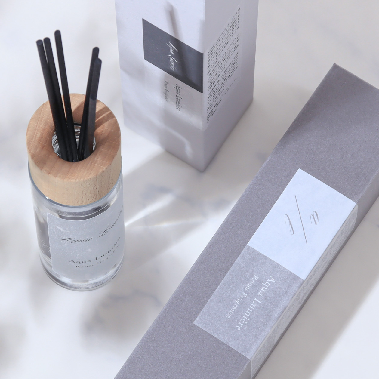 トレーシング紙のシール素材は、半透明でやわらかな透け感が特徴です。透明のボトルに貼ると、涼しげな印象に。箱の角に半分に折って貼れば、情報を分けて表記できます。ホワイトやブラックの印刷部分と、透けた素材との間にはくっきりとしたコントラストが生まれ、洗練された仕上がりに。透明感のある雰囲気は、化粧品パッケージなどにおすすめです。