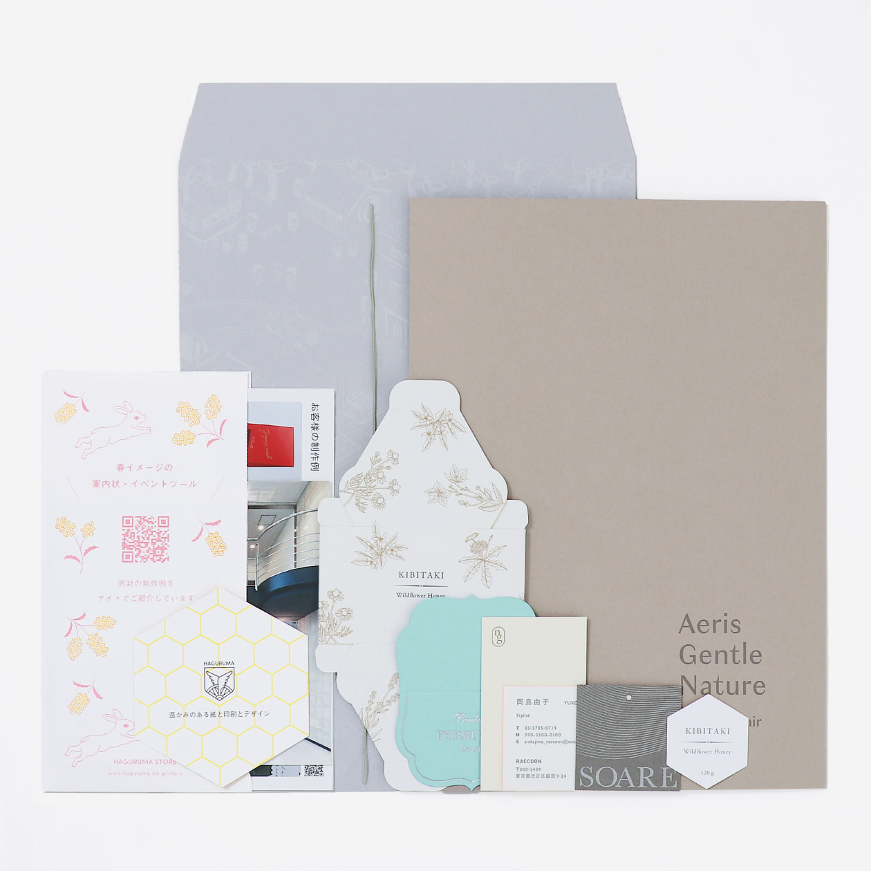上記のページでご紹介している羽車の制作例の中からセレクトした印刷加工サンプルをお届けします。紙と印刷加工の組み合わせ・風合いなど、ぜひ実際に手にとってご確認ください。