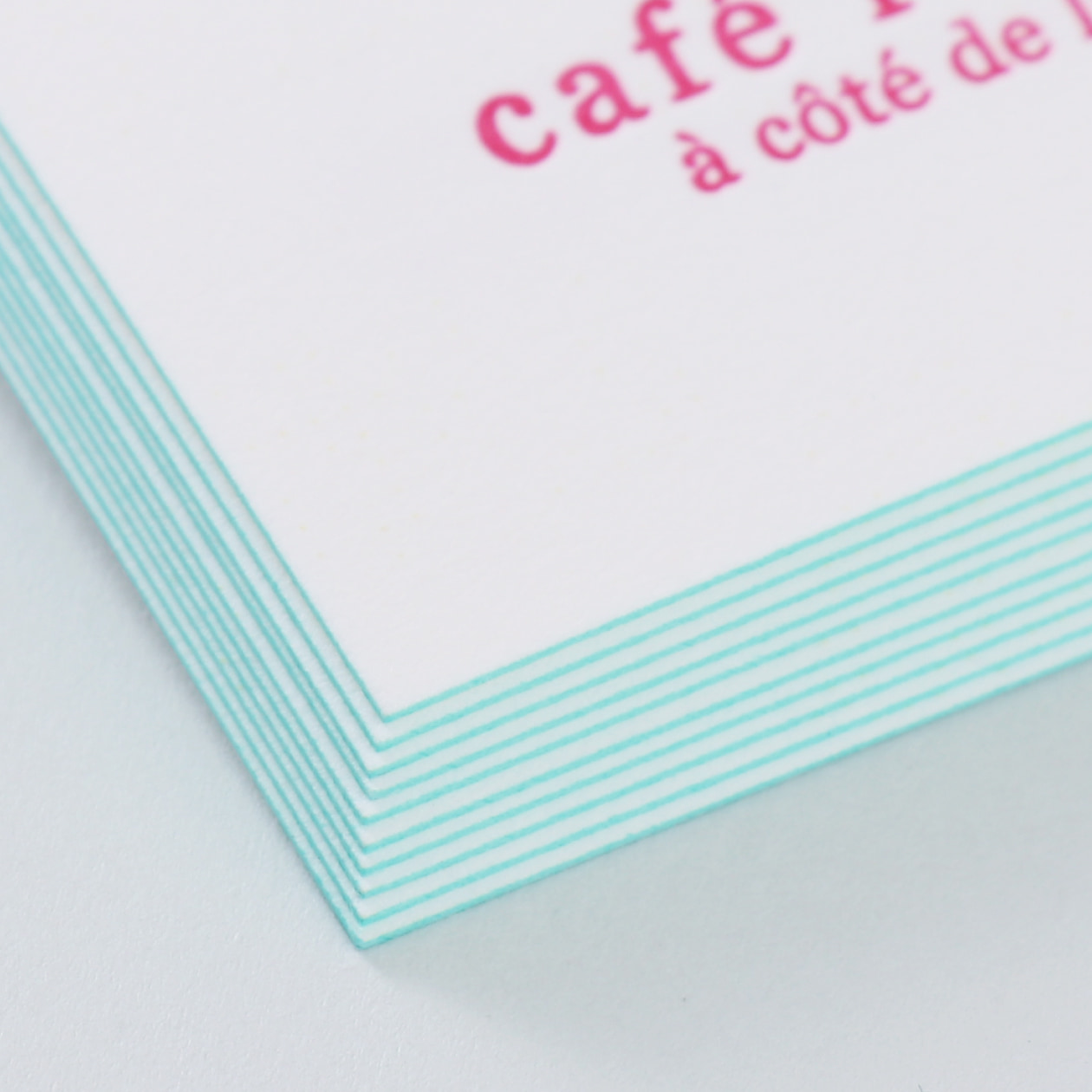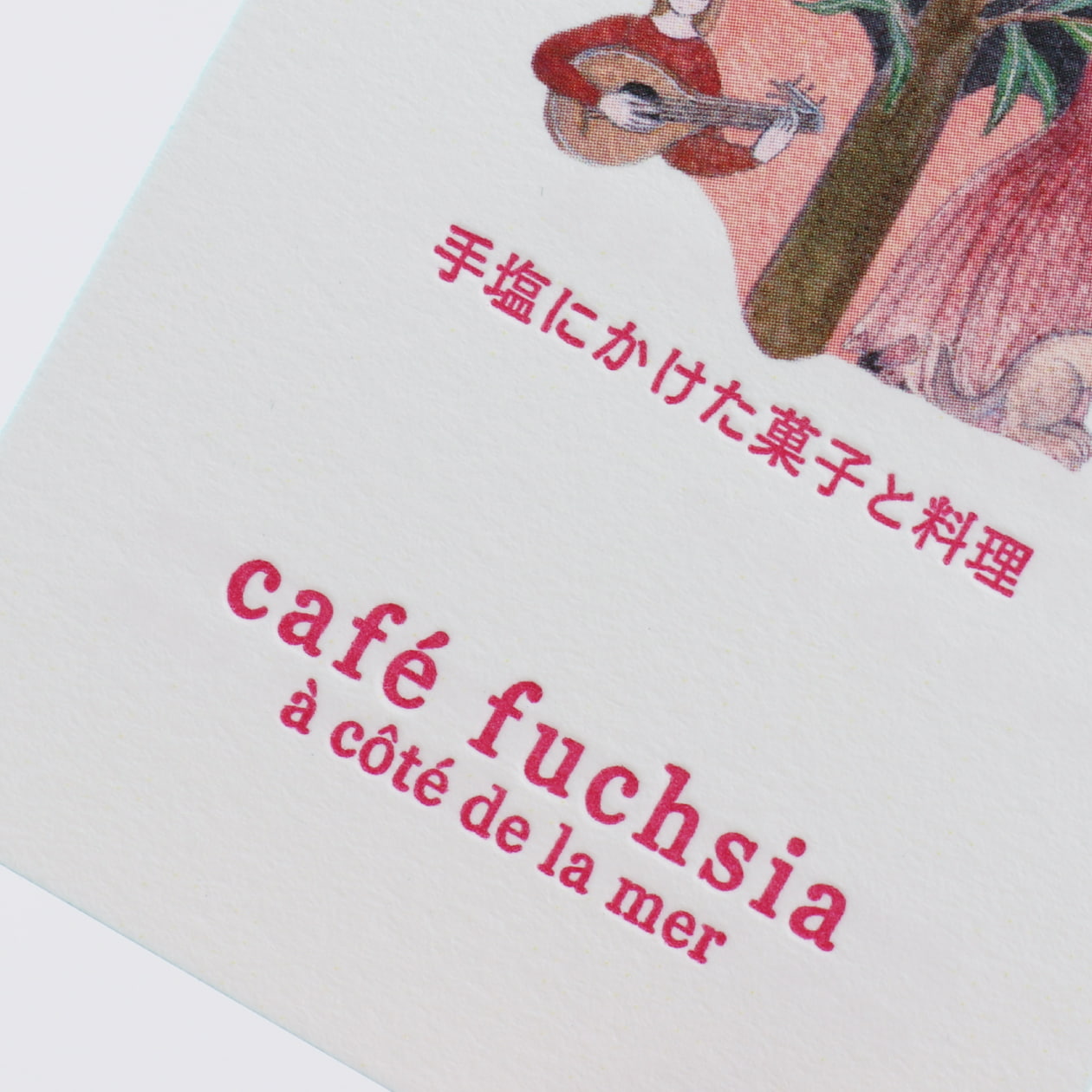 フューシャピンクとジェイドグリーンの組み合わせを愛用しているので、エッジカラーにジェイドを、店名を活版印刷でマゼンダを組み合わせてさりげなくお気に入りの色を使う事ができました。
