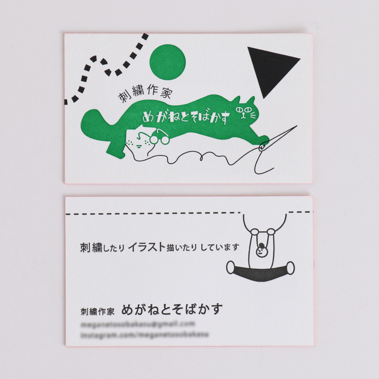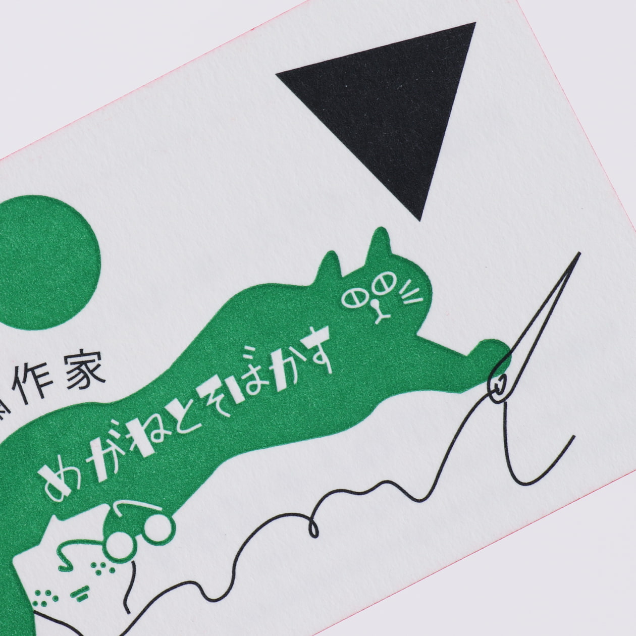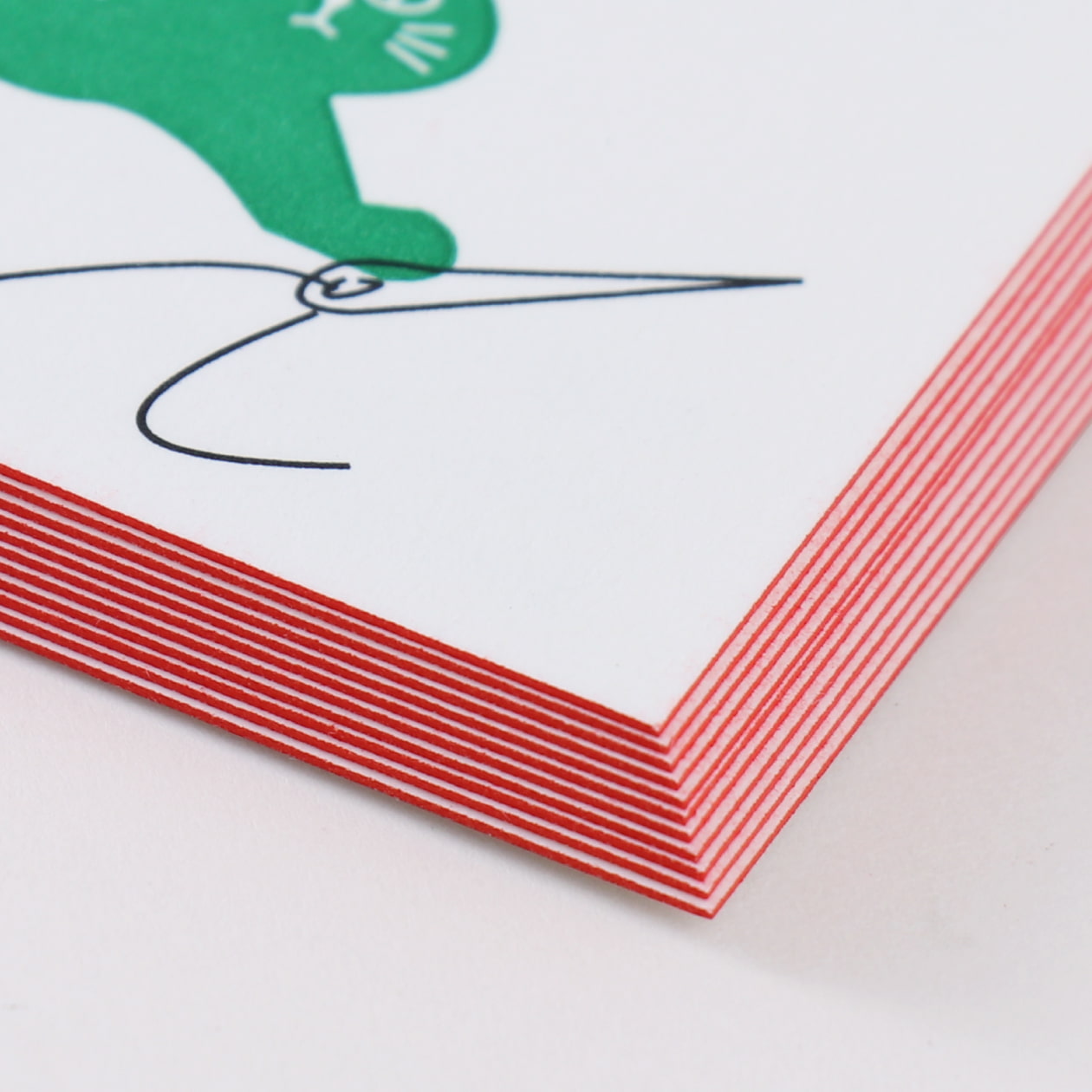 私の作品はカラフルなものが多いため、活版印刷の緑色のロゴマークと、積み上げた際に見える赤色のエッジ加工による、パキッとしたコントラストがこだわりのポイントです。