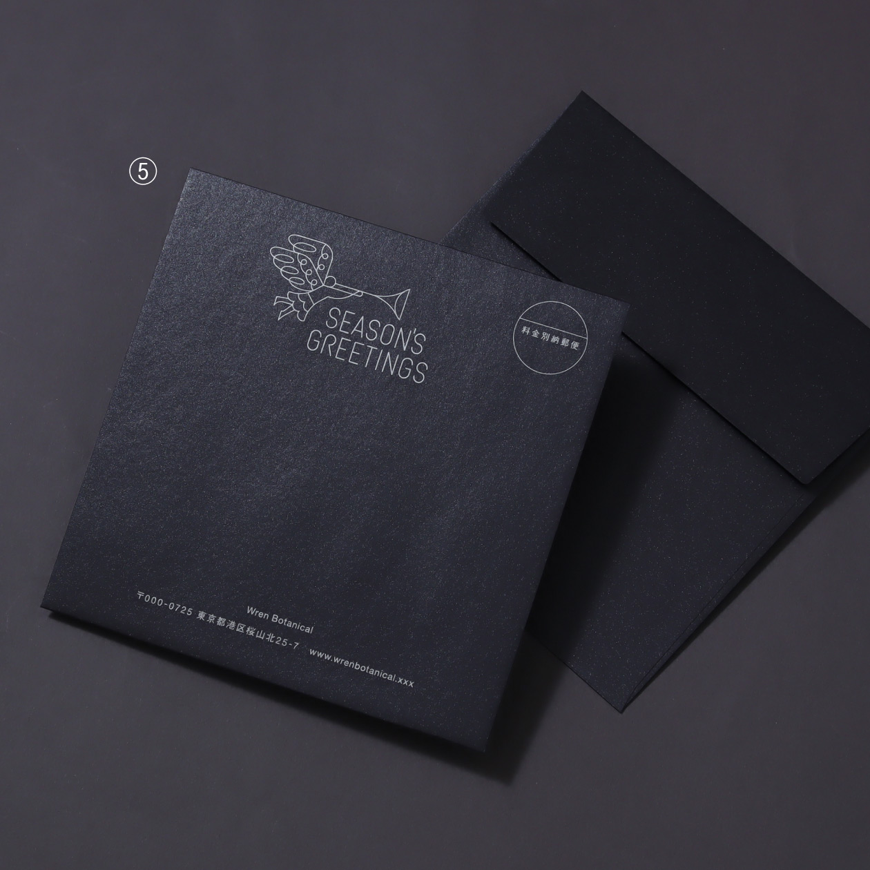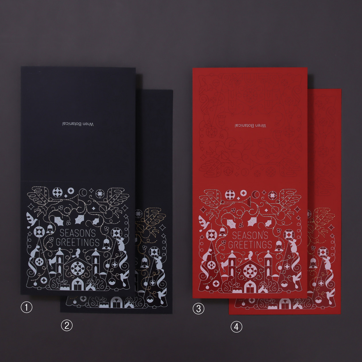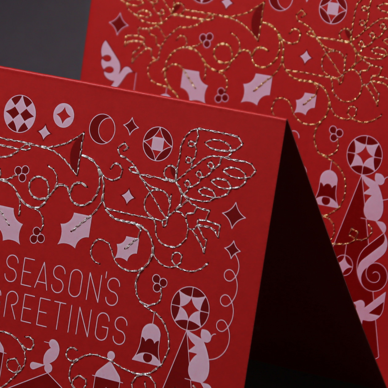 繊細な刺繍と印刷を組み合わせた、特別感のあるグリーティングカード。深みのあるColorsの紙色が、ゴールドやシルバーの刺繍を一層引き立てます。蔦や羽の曲線が、光沢のある糸で美しく描かれ、クリスマスの華やかな世界観を静かに演出します。