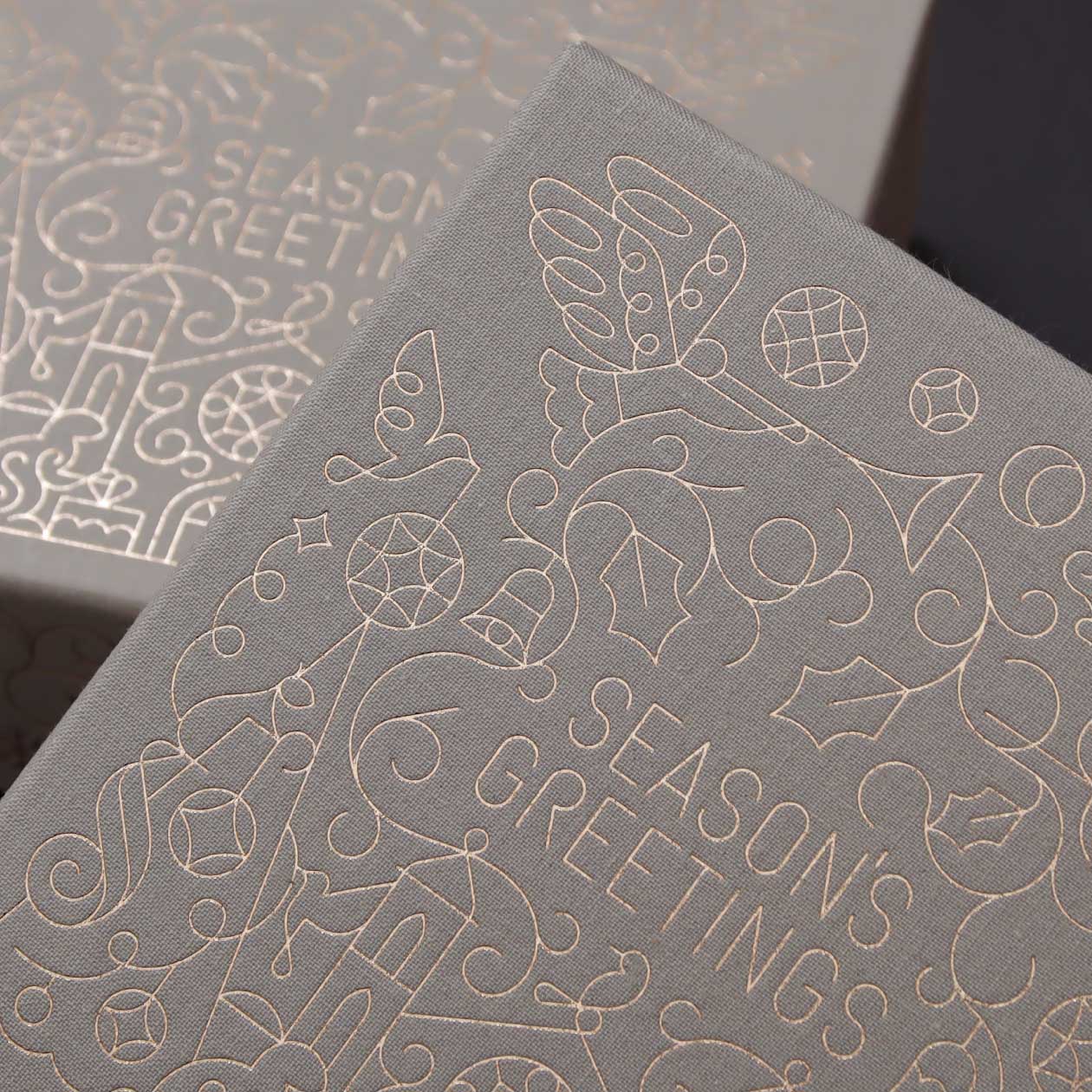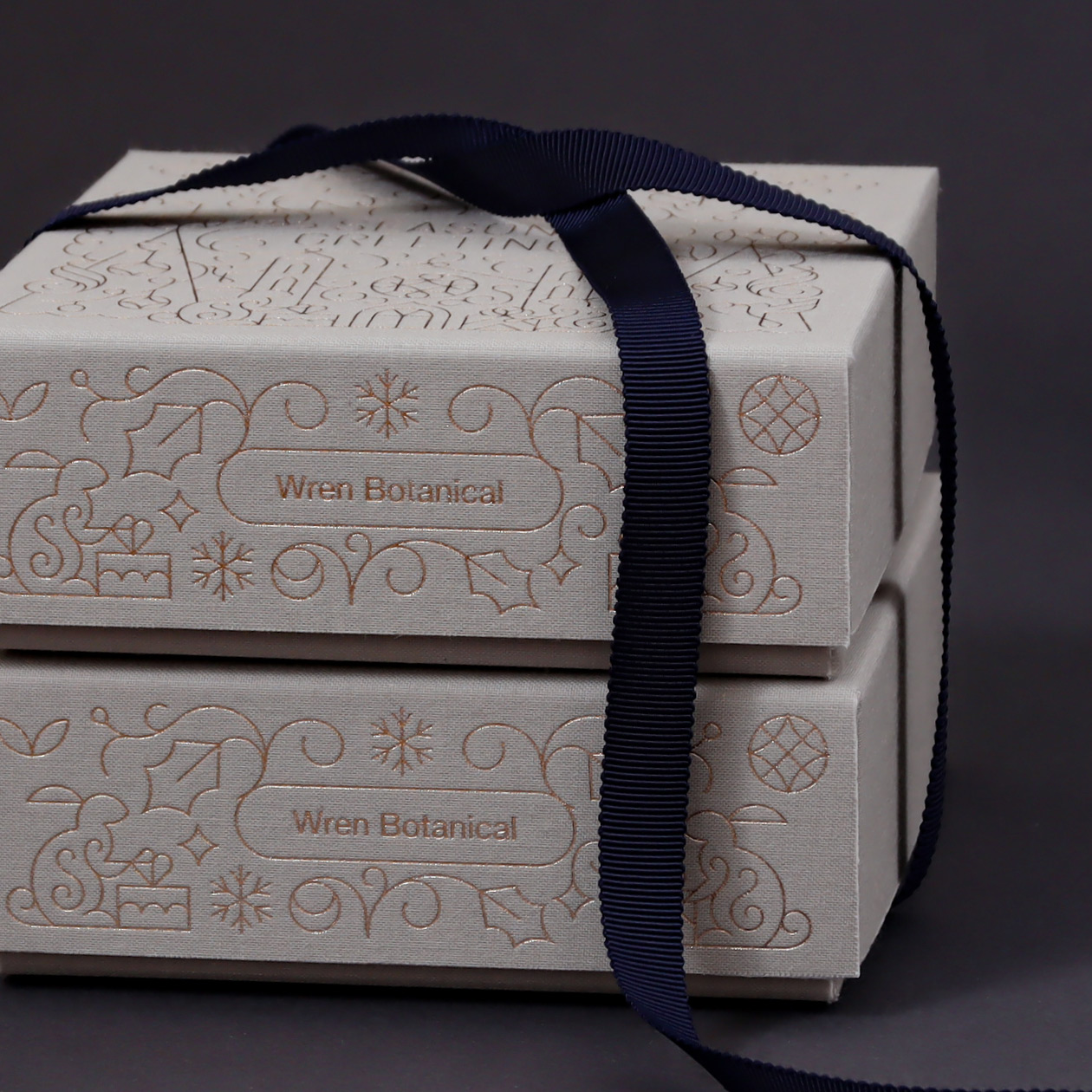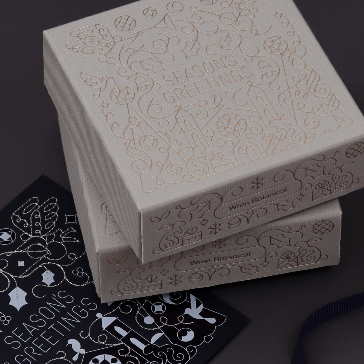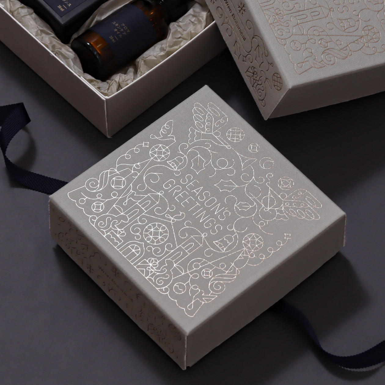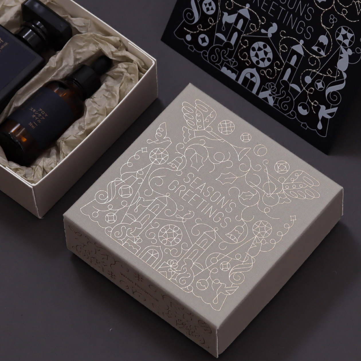 布地を貼り合わせた糊どめ箱に、ピンクゴールドの箔を贅沢に施した華やかなパッケージ。柔らかな色合いと艶やかな質感がイラストを美しく引き立て、特別なクリスマスギフトを演出します。