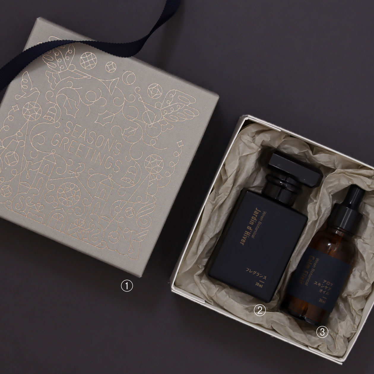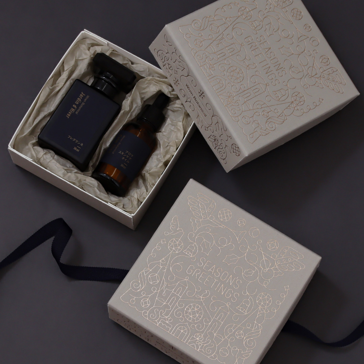 [検索タグ] 箱 Fabricシルバーグレイ 箔押し加工 シール Colorsブルーブラック オフセット印刷 クリスマス ギフトボックス コスメブランド