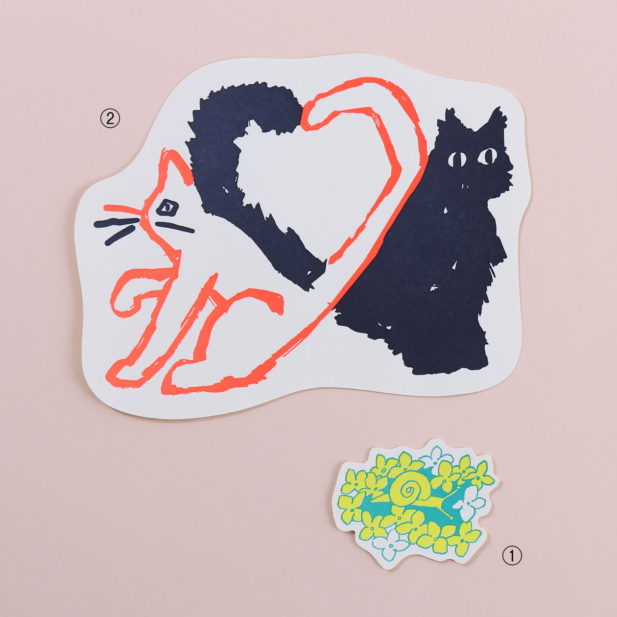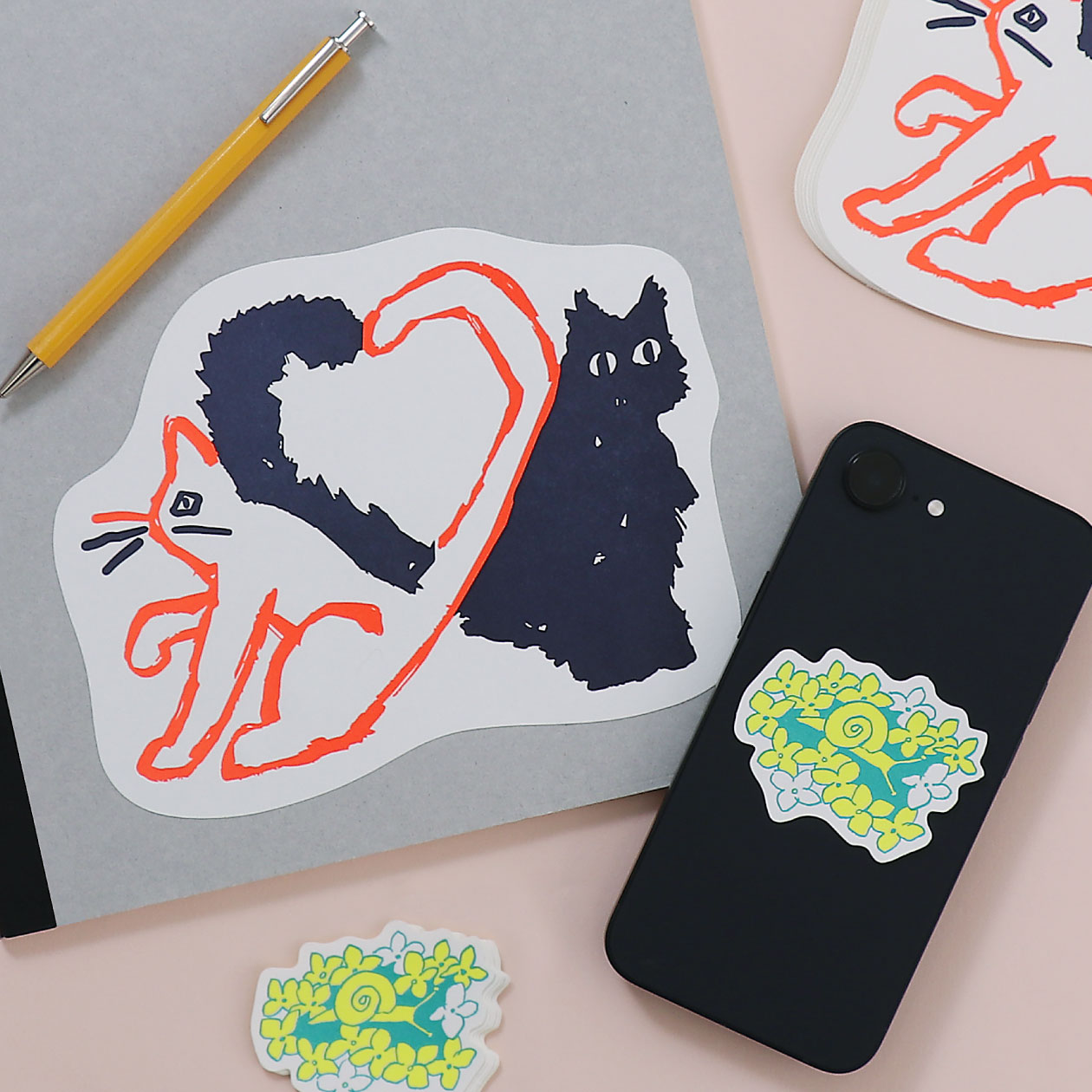 風合いの感じられるBasicの紙に、活版印刷で鮮やかなイラストを大胆にデザインしたダイカットシール。大きいサイズはパソコンやフォルダーのアクセントに、小さいサイズはスマートフォンや小物ケースに貼って持ち歩いたりと、様々な楽しみ方ができます。販売用ステッカーとしてはもちろん、販促やノベルティとしてもお使いいただけます。