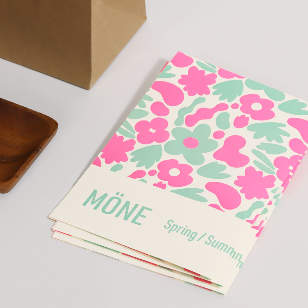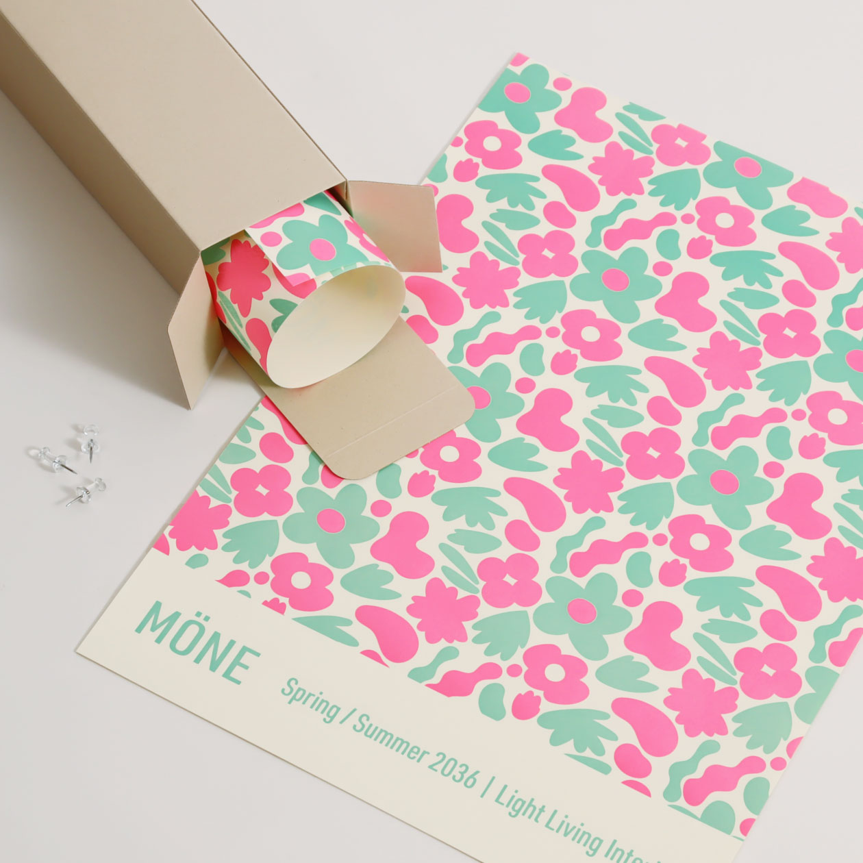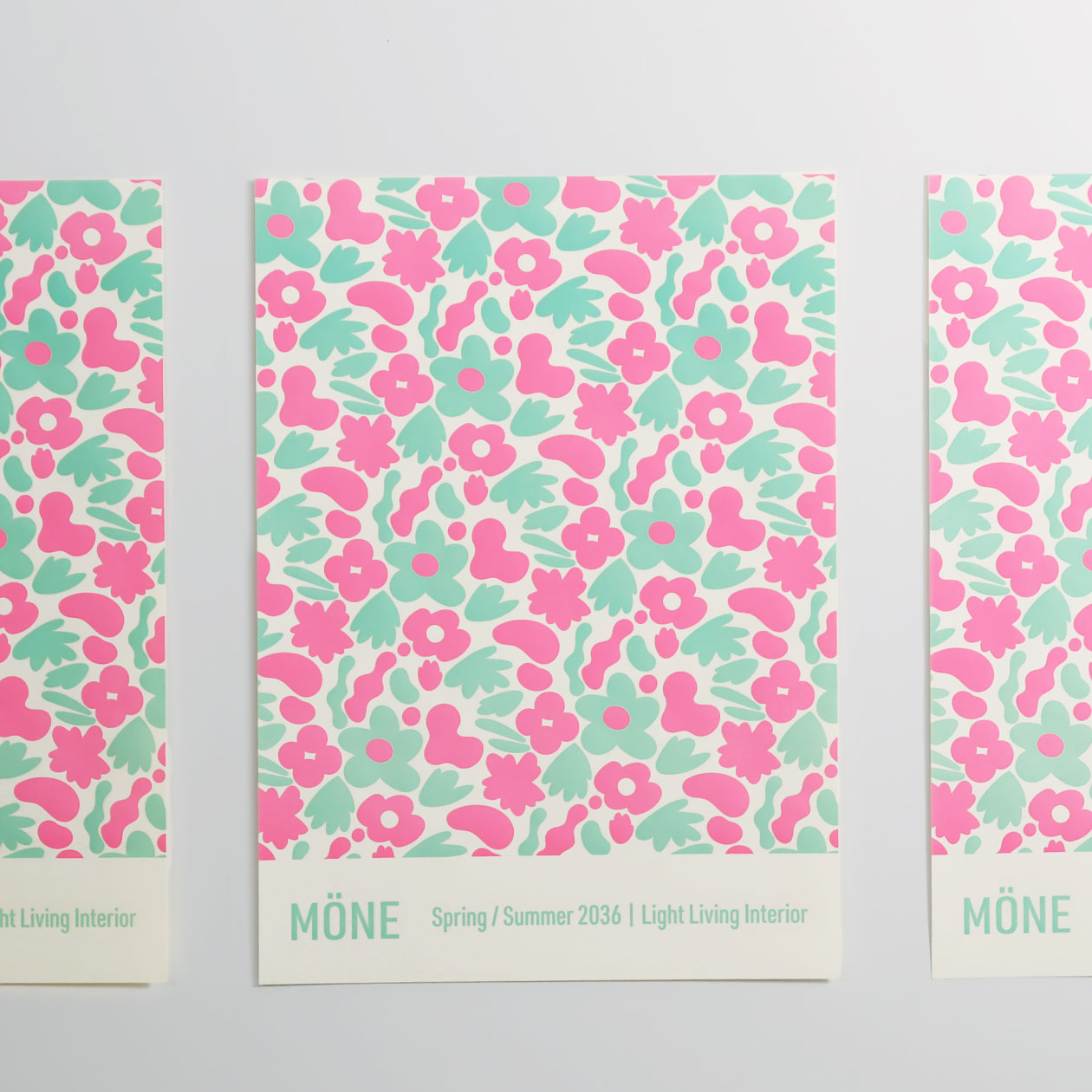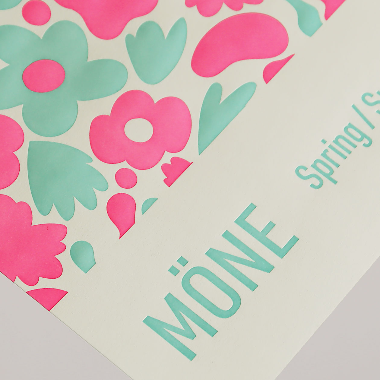 春夏コレクションのイメージを表現した、A3サイズのポスター。2色の活版印刷が立体感のある表情を生み出し、明るく爽やかな花柄のデザインが空間を彩ります。プロモーションとしてだけでなく、ブランドの世界観も感じられるポスターです。